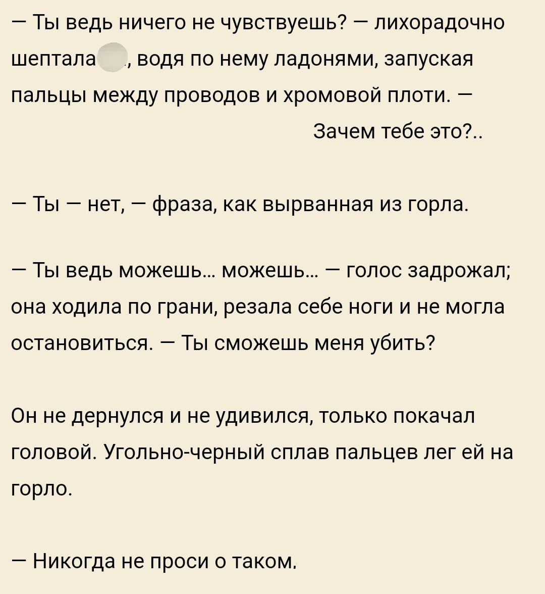 >>6338695 Мб и правда модель говно, но я тут только предположить могу. Реального опыта нет по вышеописанным причинам. Но что хуже всего - у меня пропал даже интерес к фандомам. Один душевный отыгрыш - c.ai ИНОГДА все-таки могёт - закрыл давний гештальт и теперь образовался вакуум. История, которую давно хотелось отыграть, отыграна. ВСЁ. Пустота. Жизнь тоже грызёт, а смягчить её укусы нечем. И это ещё интернет не отрубили. Если отрубят - съебу в Беларашку. Наверное.