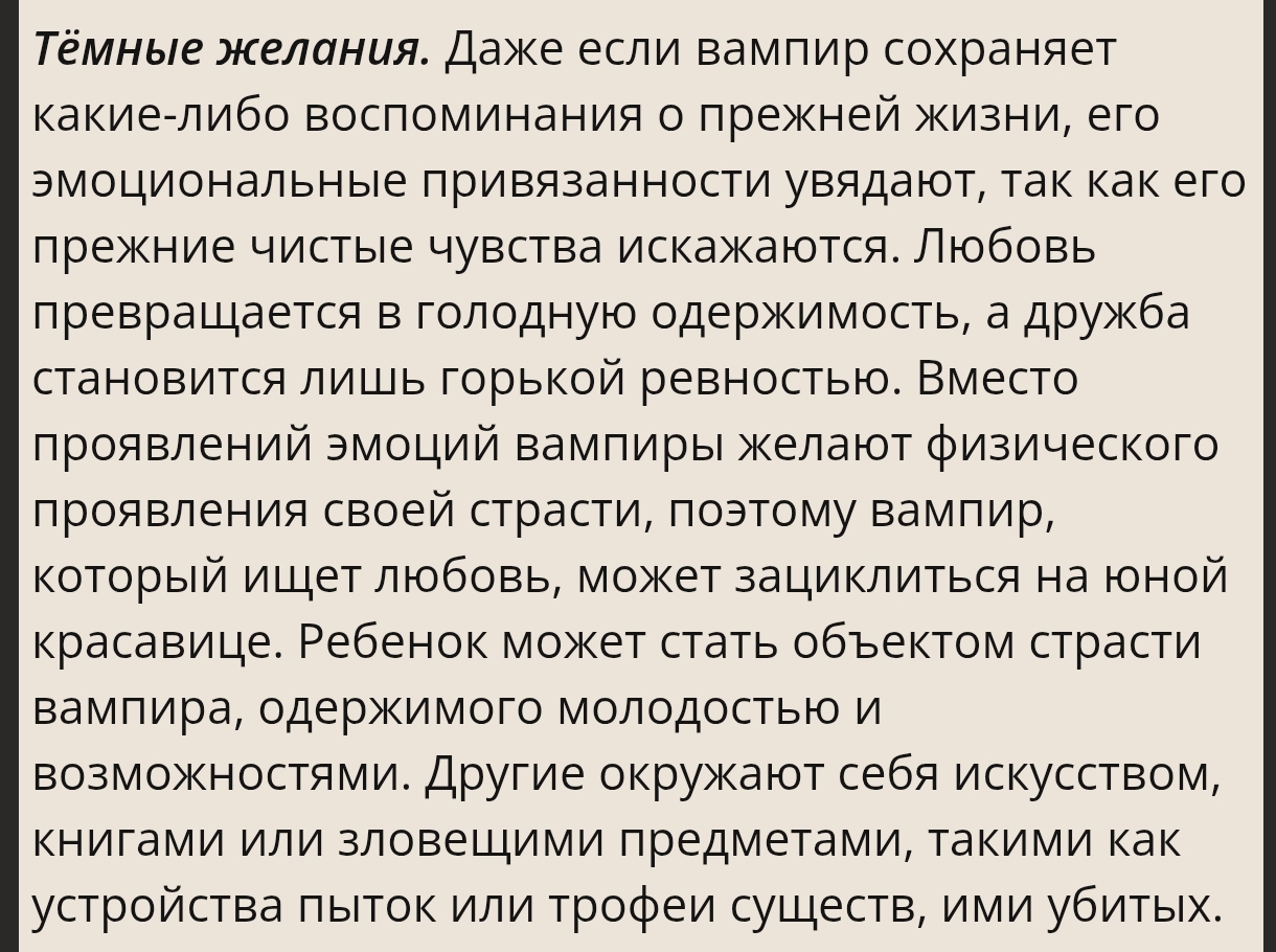 Визарды выпустили новый мануал про вампиров, так что принесу сюда краткий обзор. Особых ожиданий от этого продукта не было, напротив, были опасения, что авторов сеттинга снова унесет течением в сторону всеобщей инфантилизации. Однако в этот раз господа порадовали – вампиры в книге действительно вампиры! Жестокие, коварные и обольстительные.