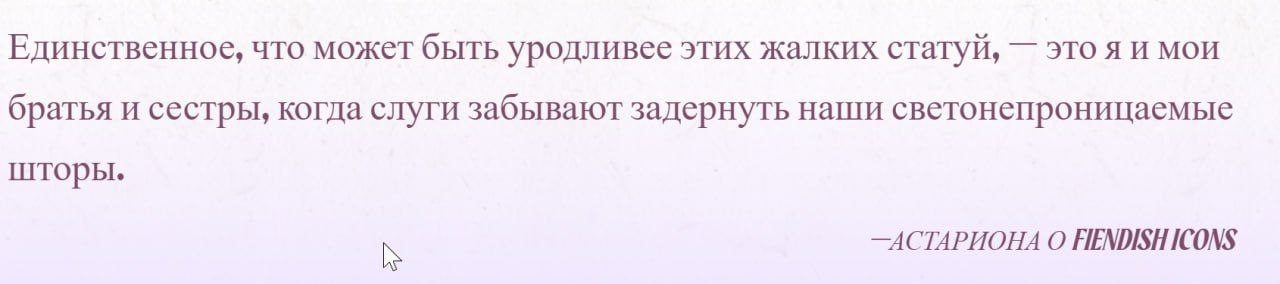 https://www.tumblr.com/marielle555/796969909079998464/its-weird-how-obsessed-this-damn-fandom-is-with Статья, что путь отродья пиздец, дискасс: Маска добродетели: Астарион между страхом и зависимостью: На пути Отродья Астарион продолжает носить маску — он лжёт, манипулирует, стараясь приспособиться. Это не просто поведение, а механизм выживания: он подстраивается, показывает ту личину, которую Тав хочет видеть. Так было с самого начала. Вспомните сцену с кабаном — тем самым, чью кровь он пил. Тогда Астарион изображает «доброго человека» — в точности так, как это принято в обществе. И спустя время, в сцене с гурами после битвы с Казадором, он снова ведёт себя осторожно, боясь, что на него начнут охотиться, и говорит правильные, «хорошие» слова. То же самое происходит и в сцене с Тав-иллитида: он выбирает безопасные фразы, стараясь никого не обидеть. В отличие от Вознесённого, который говорит Тав прямо и честно — не скрывает своих мыслей и даже предлагает ей место в своём дворце, — Отродье думает то же самое, но боится. Его речь осторожна, он опасается разозлить или оскорбить собеседника, стремится избежать встречи после разговора. Но и здесь он играет роль «доброго человека», потому что, по его внутреннему убеждению, «добрый человек» не может быть груб с «героем». Во всех этих случаях Астарион прячется за маской страха. Маска «добродетели» становится его щитом. И если взглянуть на путь Отродья с этой точки зрения, он предстает ещё более мучительным — и уж точно не «здоровым». Его слова о «разрыве цикла власти и страха, начавшегося века назад» звучат искусственно, чуждо. Это не Астарион. Он никогда бы не сказал ничего подобного, если бы говорил от сердца. Он просто подстраивается, произносит то, что должен сказать «хороший герой». Даже сцена на кладбище — театр: Астарион играет романтического героя, говорит все нужные фразы, чтобы соответствовать ожиданиям «доброго» Тав. Он не способен защитить себя, позволяет обращаться с собой унизительно. Его покорность — «Я постараюсь угодить» — лишь отражает ту же травму, что и в словах Вознесённого: «Ты унижаешь себя, оставаясь с ним…» Оставшись «слабым порождением», Астарион навсегда прячется за маской. Он не смеет показать себя настоящего, живёт так, как «должен». Его неуверенность только усиливается: он цепляется за Тав как за единственного, кто проявил к нему хоть каплю доброты, и становится тем, кем она хочет его видеть.