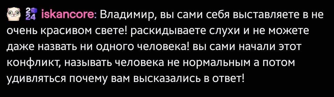 >>6320880 Тут дело в том, что Губами говорил подписчикам, что как только купит квартиру в Омерике - перестанет рекламить казик. Но квартира была куплена как минимум до 10 октября 2024 год (свадьба Зубарева и его тян Алины, где Алешенька и рассказал Вовочке про покупку этой самой квартиры), но дело то в том, что казино он не перестал рекламить. Он просто умолчал о покупке квартиры и стримил казиныч еще минимум четыре месяца. Этот тейк Вови был к тому, что Хесус его пиздаболом выставлял. Мол шеф пиздит про то, что много знает, а на деле нихуя не знает и просто дебич. И тип у него очко окончательно сгорело и он решил принести такую инфу. Ну и как я поняла, ДК этот "тейк" тоже касается потому, что тот тоже просит пруфов, а когда Вова отказывается - называет пиздаболом. За пунктуационные ошибки прошу прощения мне на работу завтра я из прсоедних сил выпердела этот текст