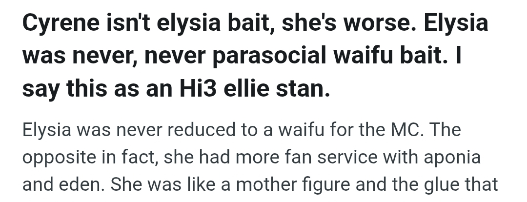 Какие же хонкалята тупые...элизия точно не вайфу байт, ну и что, что она флиртует с игроком, ну и что, что она на китайском говорит "не доверяй реальным девушкам", она не парасоциальный вайфу байт!! тупой хэсээр испортил пинк юри джисус