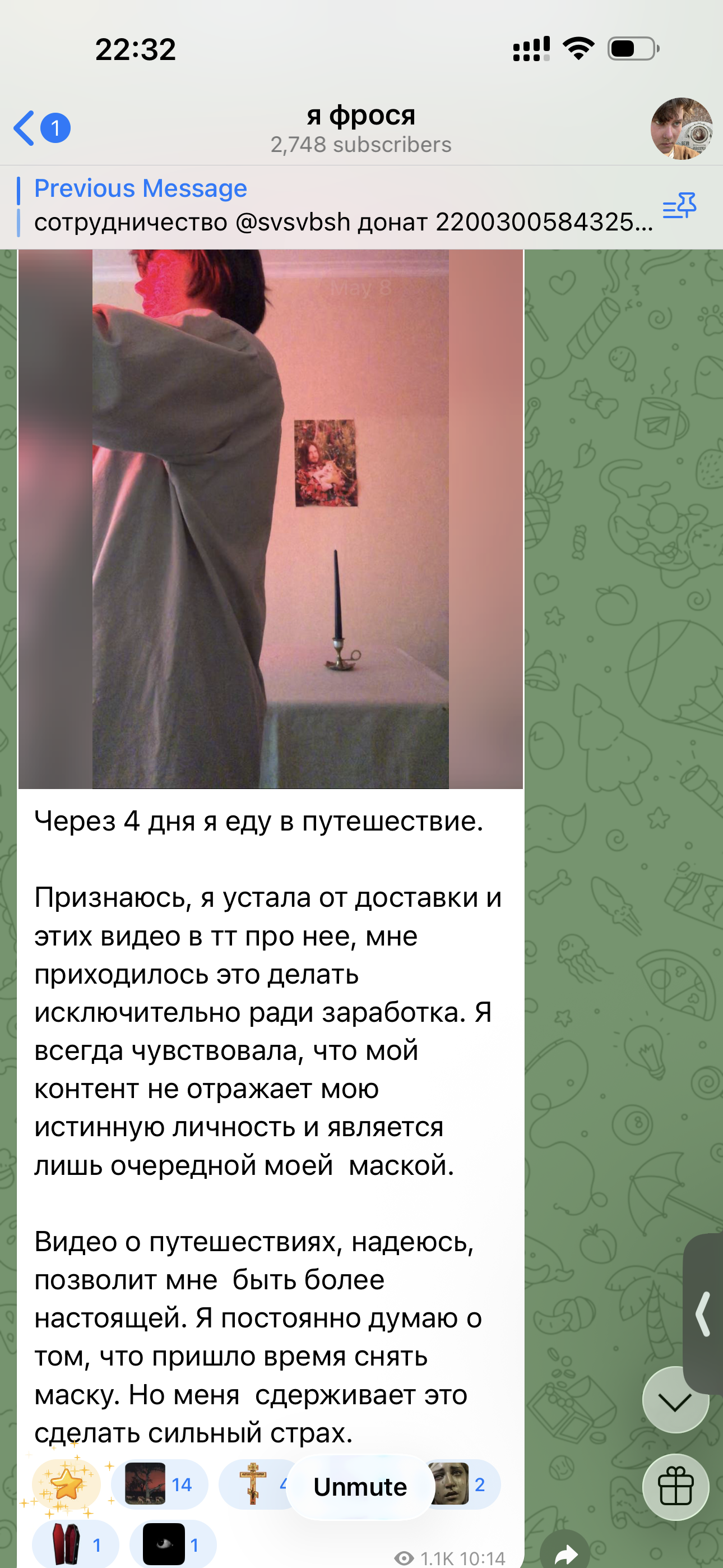 Немного лора персонажа. Оказывается рантше снимала видео в маске о жизни будучи курьером, копила деньги на что-то, потом сняла маску поехала путешествовать на кредитные деньги, лол.
