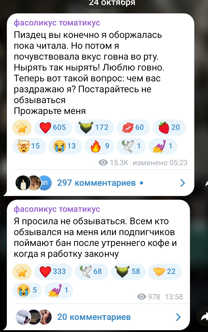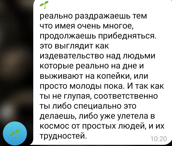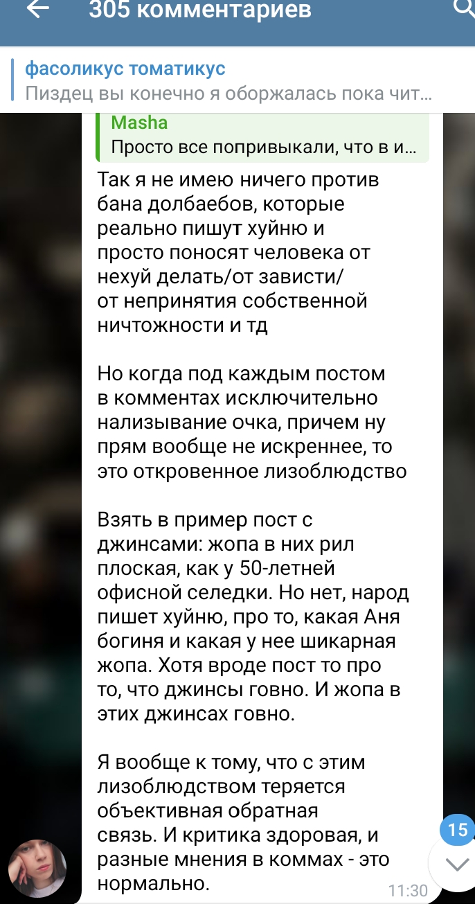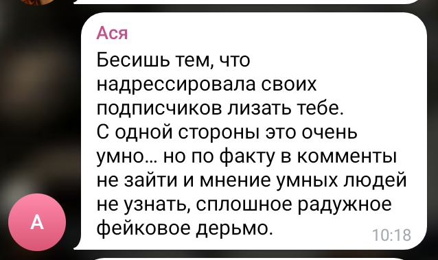 >>6319212 Так все по факту. Это же лицемерие, все вокруг матерятся, но когда ребенок матюкнется, то ему затрещину дают и рот мылом моют. Это насилие. У меня в семье была шиза, что матерные слова - это молитва сатане. Что произнося их ты разрушаешь свою душу, потому что они воздействуют на воду в теле, а вода впитывает информацию (помните на первом канале был фильм "вода", там показывали как красиво вода кристаллизуется в снежинку под моцарта, и как кристаллизуется в говно под сатанинский рок). Я не могла его слышать меня корежило, что уроды портят воду и разрушают мою душу, от чего я могла подойти к компании сверстников и начать проклинать их, говорить, что они мрази, твари, что они сгорят в аду. Причем с такой концентрированной злобой - это особенность всех "нематерящихся" людей, типа они же не матерятся, значит априори не могут сказать ничего обидного, и можно жестить как угодно. Потом меня отпустило. Потом оказалось, что все мои святоши-родственники, в том числе и те, кто орал на меня за случайно сорвавшийся матюк, кто мыл мне рот с мылом, и даже моя бабушка-одуванчик - все матерятся. Только мне зачем-то пиздели про "нравственную чистоту", а на деле просто повод был, чтобы вести себя как гнида и издеваться над ребенком.