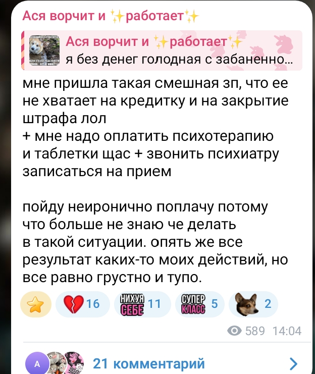даже жопорихи в коммах охуели от терпильства зумерши, а та хуйню про кризис придумала вроде говорят, что психуелоги уничтожают семьи и заставляют женщин разводиться, а тут она вместо старого доброго срача с мужиком подводит его мразотство под какой-то кризис и дефает его