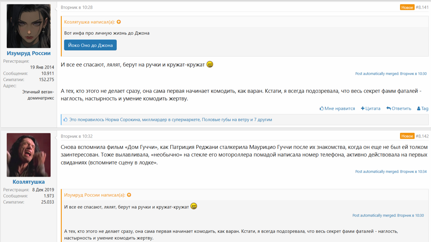 А вы тоже кекаете с того как бабки с багини обсирают успешных женщин типа Йоко Оно, Лили Брик и Мадам Гуччи (или как там её) потому что те охмурили богатых мужиков? У бабок как будто синдром хороших девочек которым оладухи достались. Отдельный кек насчет именно Йоко - да у Леннона дохуя группиз было, он мог кого захочет выбрать, но плохая именно Йоко.