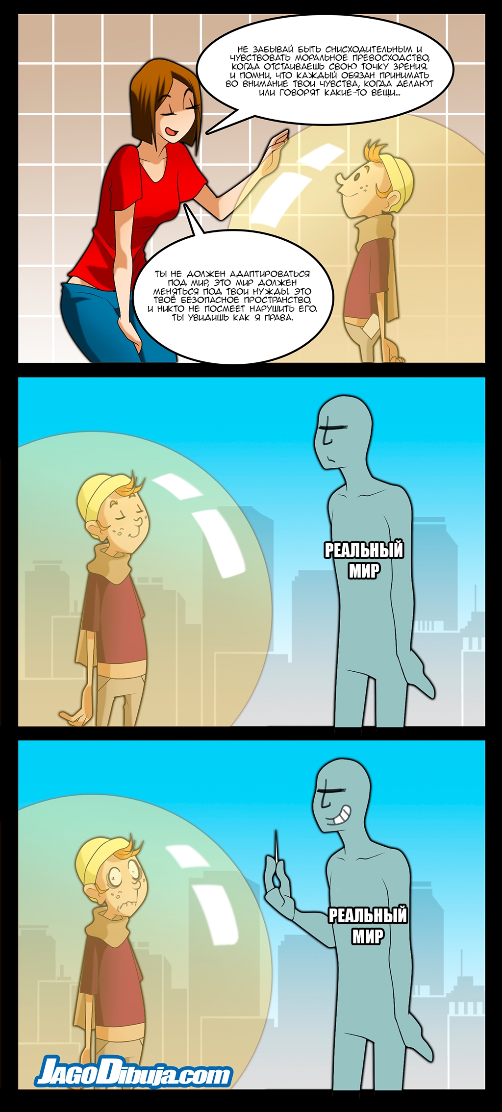 И что произошло в итоге? Она верит без тени сомнения в то, что она звезда. Что она — гибкая сексуальная кошка. Что её активизм меняет мир. Что её уёбские партаки — произведение искусства, а кольцо в носу не делает её похожей на корову. Что её мнение имеет значение. И так далее. И сейчас эта бедняга, как птенчик из гнезда, вывалилась из своего профинансированного на деньги американских налогоплательщиков сейфспейса в реальный мир, в котором на неё, внезапно, всем похуй. Повсюду какие–то злые люди, которым насрать на её политическую позицию, которые не бегут наперегонки её хвалить и оплачивать хату на Элисейских полях. И ей пиздец как больно и грустно быть бомжом.