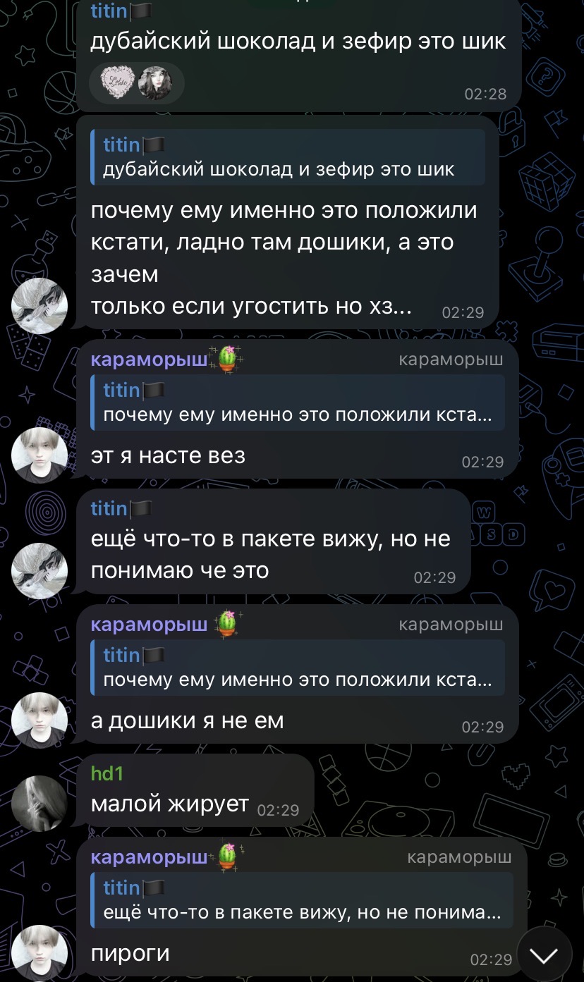 И так, помните жалобы Караморы на ее родителей и финансовое положение, слова о том, что она родителей «чуть-чуть любит»? Родители отправили на поезде ее несовершеннолетнего брата к ней в Питер. Ехать ему было всего пол дня или день. Дали ему с собой покушать и как гостинцы Настеньке кучу угощений, в том числе корейский виноград большой, зефир, куча шоколада. До такого хрючева как дошик они даже снизойти не могут. В пакете не дошик, а пироги. Теперь хочется услышать защитничков, которые говорили, что «уж в ее-то ситуации» она не могла ни кем стать, кроме как продажницей пиз ды. Напоминаю что еще ее родаки на море гоняют каждый год. Жалеем дальше?