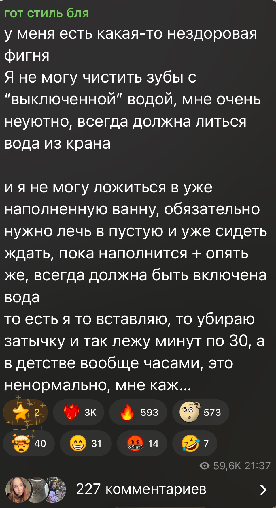 >>6321591 А мне просто фоновый шум воды нравится. Для экологии и счетов за воду это не очень хорошо наверное. Касаемо того чтобы ложиться в пустую ванну и ждать пока вода наберётся, то сейм причина + хочется подольше в ванной чиллить. Надеюсь ей написали, что её "странности" это абсолютно нормально?