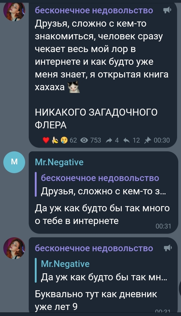 >>6325116 Мне уже кажется что она угарает, ну не может быть настолько манямирок у человека. Какой еле наскребла 7, там никаких бурлений говн, если там КАЖДЫЙ комментарий это плевок в её сторону с кучей лайков? Еле наскребла 7 это комменты с поддержкой в её сторону, Анечка путает. А с её ответа в телеге в голосину проорала. Так не задевает, что она уже пятый или какой там день подряд срёт всевозможными ответами хейтерам и думает что выглядит круто. И конечно же бинго БЫВШИЙ ГОВОРИЛ ЧТО У МЕНЯ СТРАННО ШЕВЕЛИТСЯ РОТ, наверное это тоже не задело)00