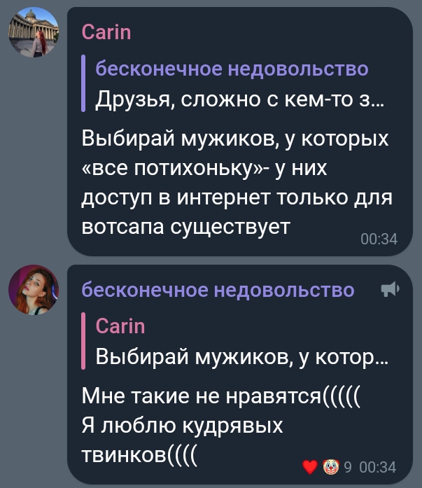 Даже такую как она травокур Марк водит по заведениям и угощает за свой счёт, рисует сердечки на грече кепучем и носит завтрак в постель. А образованная благообразная Диасик пополамит и жалуется, что мушмуш мышмыш не ебёт(