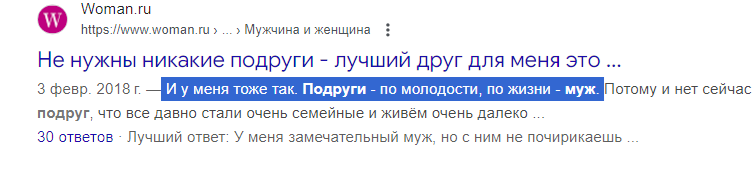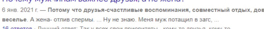 >Не нужны никакие подруги - лучший друг для меня это муж. >Я вот всю жизнь не особо общительная, скорее интроверт по натуре. Подружки и раньше иногда напрягали, а когда вышла замуж, так и вообще отпала необходимость в общении с ними. Мне со своим мужчиной комфортно и общаться, и развлекаться, и по магазинам ходить.