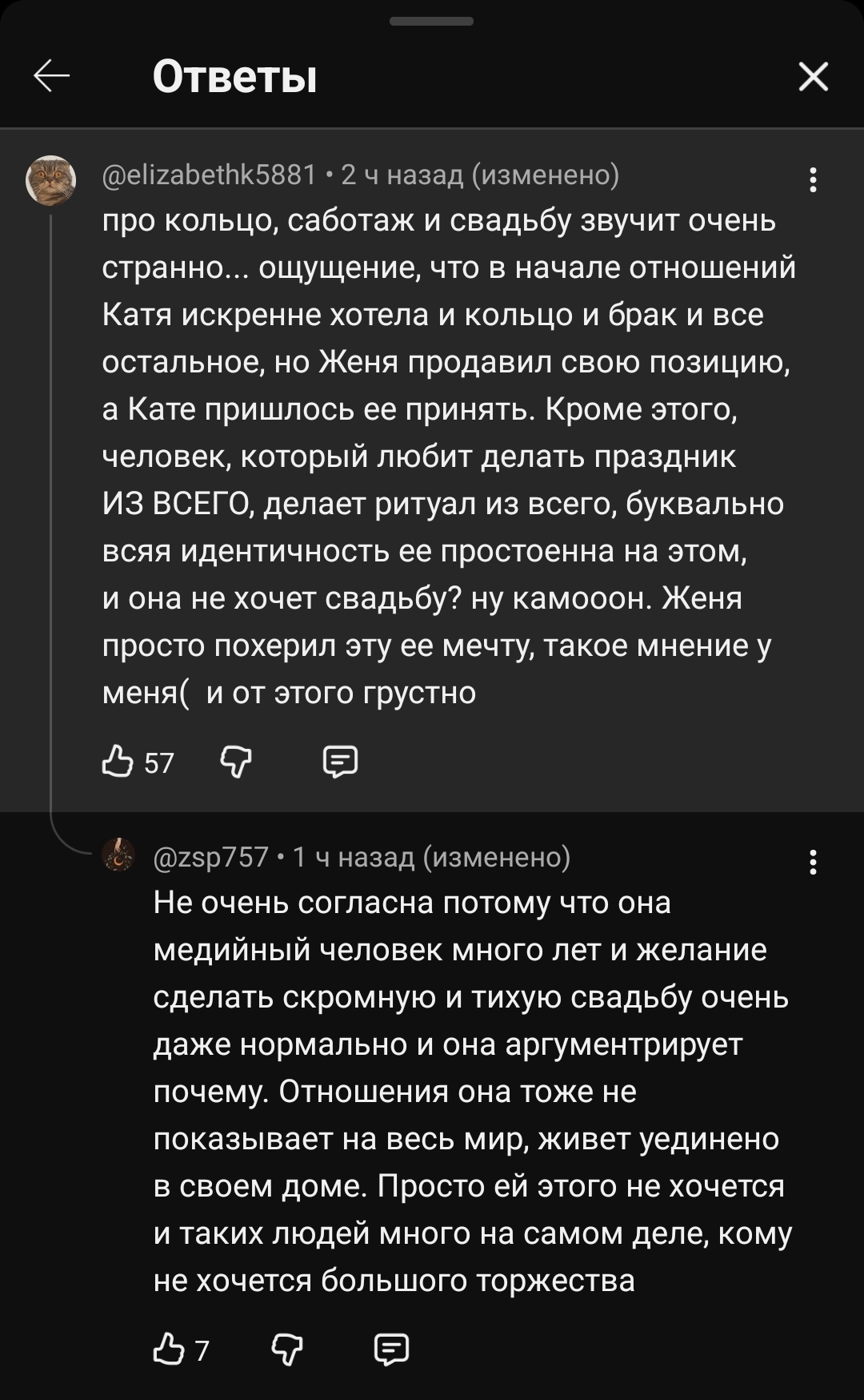 Соглашусь. Есть несколько знакомых парочек, которые давно живут вместе. Девушки очень хотят заветное предложение, а парни наоборот отнекиваются, что это всё не нужно, и так ведь всё хорошо. Тоже как говжен не понимают зачем нужны эти ваши свадьбы и браки, хотя им вся родня с обеих уже давно мозг выносит когда свадьба. Один сказал «если решим разойтись, то просто разойдёмся, не надо будет разводиться и пилить имущество, удобно». То есть отношается и живёт с девушкой, а уже подспудно думает как им разойтись, лол.
