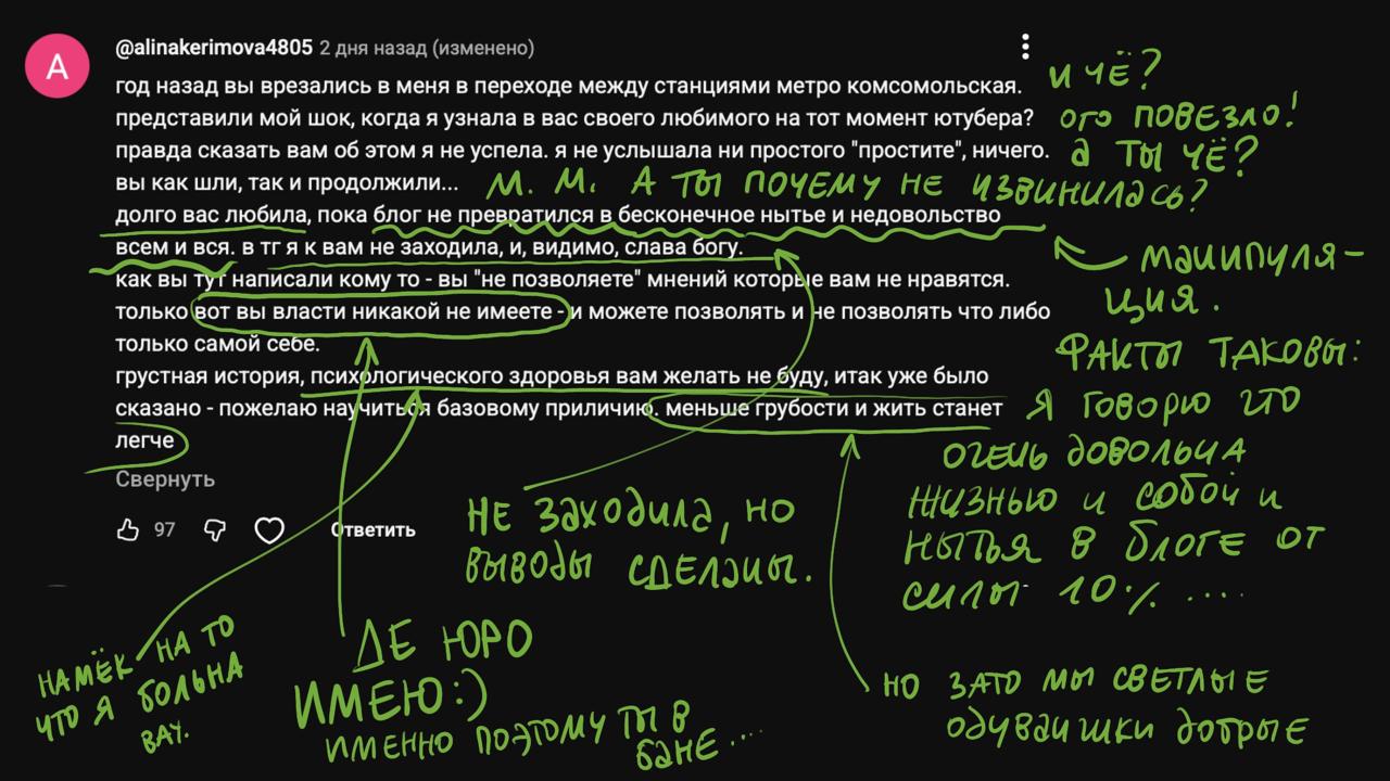Какая же эта бабка мерзкая охуевша пизда, всех считает грязью из-под ногтей. Я, конечно, понимаю, что пишут ей там довольно наивно, но ведь без всякой злобы. Даже те тик-токи, где она вроде бы верно говорит о женских проблемах, видно, как она приосанивается над теми, кто не сделал карьеру и живет более скромно, чем она. Причем, чем дальше - тем больше она хамеет. Прям какая-то бабкинская версия консервы, везде хамство и обидки, нейтрально отвечает только тем, кто совсем жопу без стеснения лижет.