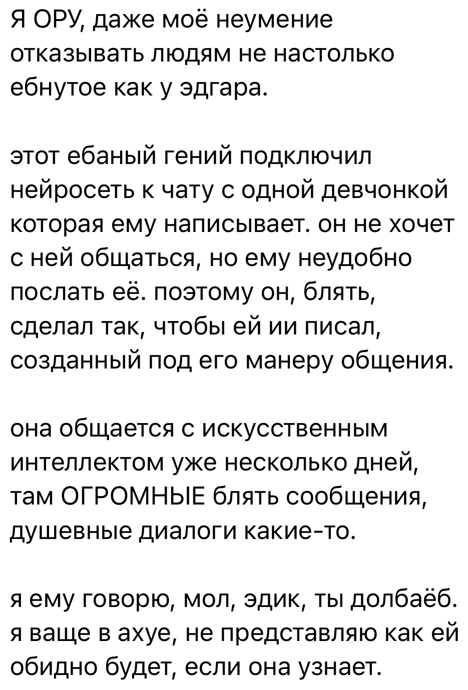 И про то, что он плачущую утешает это нихуя не показывает уровень эмпатии. Вполне возможно он на людях эту хуйню делает, чтобы социальные бонусы получить. И доводит ее до слез также он, а потом дурачком прикидывается, мол она сама что то там истеричка.
