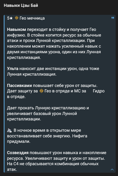 Блять, понимаю, что выкрутила Кирилла и нихуя не получаю удовольствия от его геймплея, ощущается неприятно. Неприятно нормалами бить в ожидании, когда будет готова ульта. Какой-то кривой для меня геймплей, ведь он с нормалов нихуя не наносит, но при этом надо стоять ими бить тратить время ждать энергию, это костыль какой-то, а не нормальная игра. Ощущение, что он должен играться иначе, типа: ешка, срыг в карман, ульта готовится, достаешь из кармана ультуешь. А не вот это все. При этом они закокблочили кажется даже этот режим в принципе, он вроде если в карман уходит, ешка дольше откатываться начинает и ульта вообще никогда не наступает.