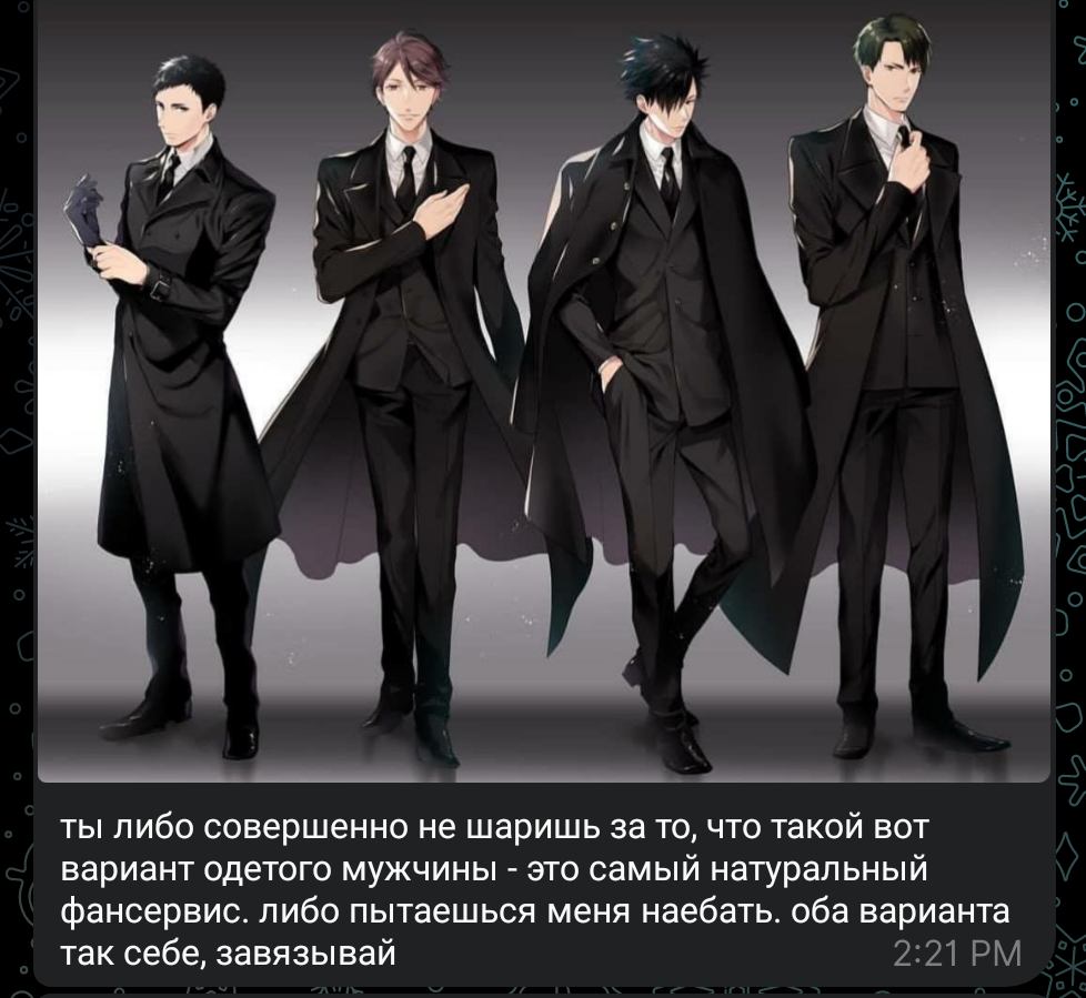 Вот пример нормискота, кста. Гоев так уже накормили нормой, что мужиков сексуализировать нельзя, что они с пеной у рта теперь доказывают, что тулуп - это тоже своего рода фансервис.