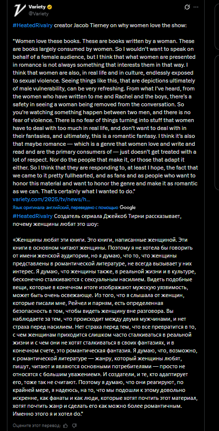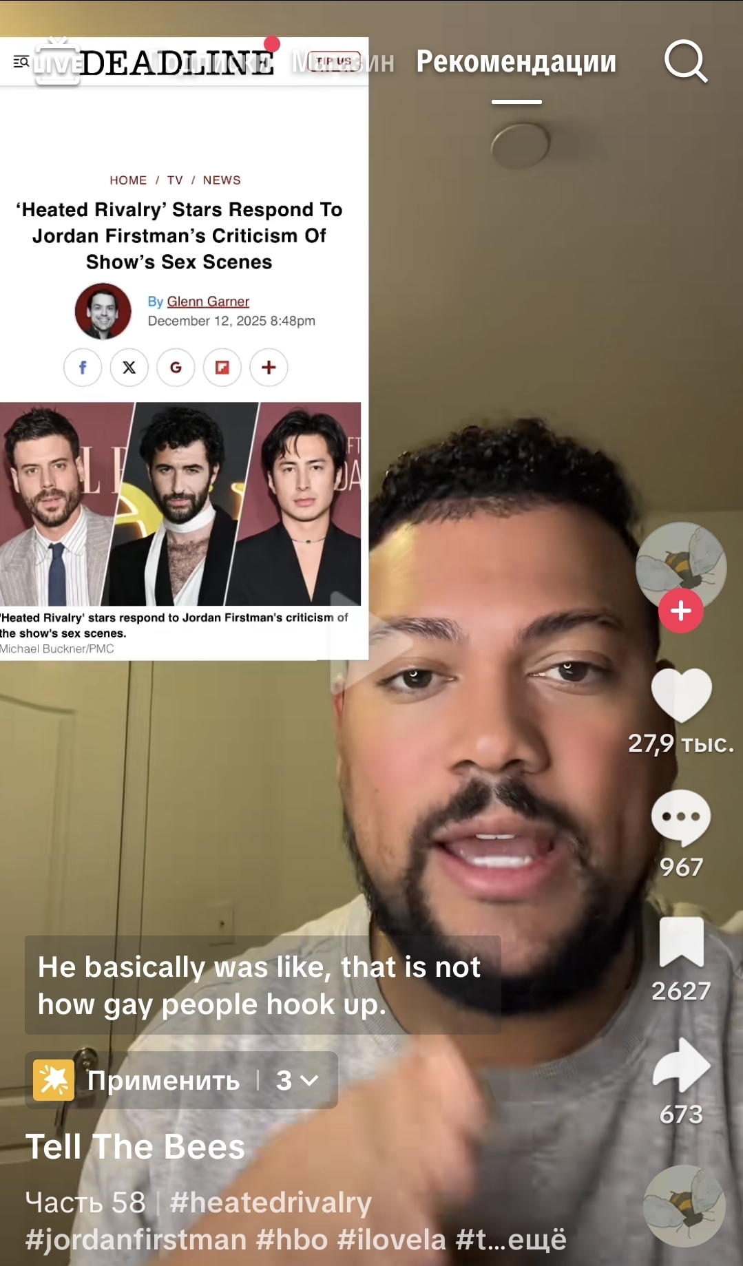 Я так и знала, что это хуйня начнется, геи пришли рассказывать как писать фанфики и потом их экранизировать. Какой-то угар, отрывок из тиктока: >Its ok for these men to get rich and get famous off of the back the queer people Шо? Какие квир пипл? Квир пипл не делают это шоу популярным, женская фанбаза делает. Даже если множество геев смотрит.. Сериалы где геи аутентично трахаются, как и нравится автору статьи, так и остались нишевыми и ни в какие топ 1 по стримингам не выходили