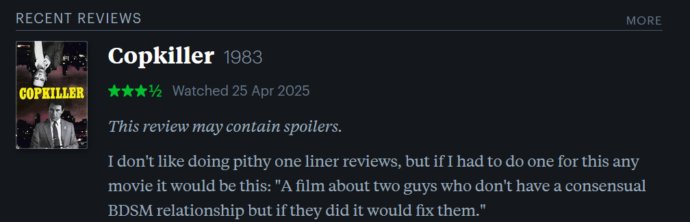 Ща тоже любимую годноту в жанре коп + преступник + гомоэротическое напряжение прорекламирую. Убийца полицейских (1983). В гл. ролях Харви Кейтель а вы тоже согласны что бешеные псы это лавстори и Джон Лайдон ака Джонни Роттен из секс пистолс. Ну и вот эти ребята разъебали короче. Отличное джалло которым можно понтануться в синефильских кругах.