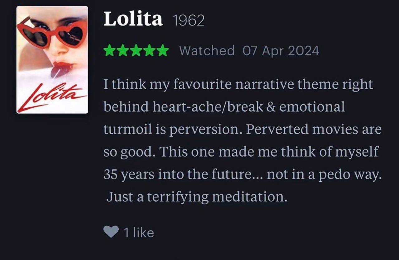 видели новость, нашли анонимный леттербокс актера шейна (Хадсон Уильямс) из жаркого соперничества (щас уже все удалено), самый крипповый отзыв был на лолиту...что вообще значит фильм заставил задуматься о будущем не в педо смысле, все таки чухан есть чухан, каким бы прогрессивным няшкой он себя не выставял