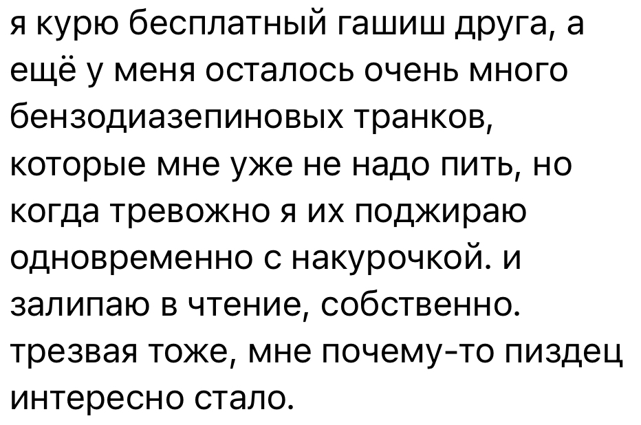 >>6367697 О, у меня тоже разблокировалось воспоминание (кринжовое) Я как-то пошла кататься на скейте на площадь возле администрации, а там шли какие-то ремонтные работы и мужик ходил туда-сюда контролировал. Мне почему-то было неловко уйти кататься в другое место, потому что это было бы как-то НЕКРУТО, и я стала кататься прям там, несмотря на то что я явно мешала проводить работы, да и они мне тоже мешали шумом и пылью кек. И тот мужик несколько раз сказал что-то типа «мешаешь!», но он был далеко и я была не уверена что он сказал именно это и мне, и не знала че делать, и поэтому просто достала телефон и стала делать вид что разговариваю с парнем и тихонько говорила в трубку «да да я тоже тебя люблю»…… мне было 13 лет Я унесу эту историю с собой в могилу…