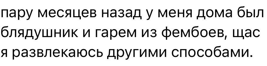 >>6368077 >Не поняла, а в чем проблема тогда? Да мне в целом похуй, просто странно было. Ну тип у кунов там не было статуса пиздолиза, но мы хорошо общались и зачем. >>6368093 >Куны же тоже ультимативно требуют удаления всех "друзей" и от любого левого общения бомбят. У меня ничего не требовали и знакомых мужского пола немало. Вообще 0 бомбежа по этому поводу. Мне тоже поебать. Я бы напряглась может, если бы у куна была подруга, с которой он постоянно виделся наедине или появилась новая подруга, с которой они много общаются. А так чисто похуй.