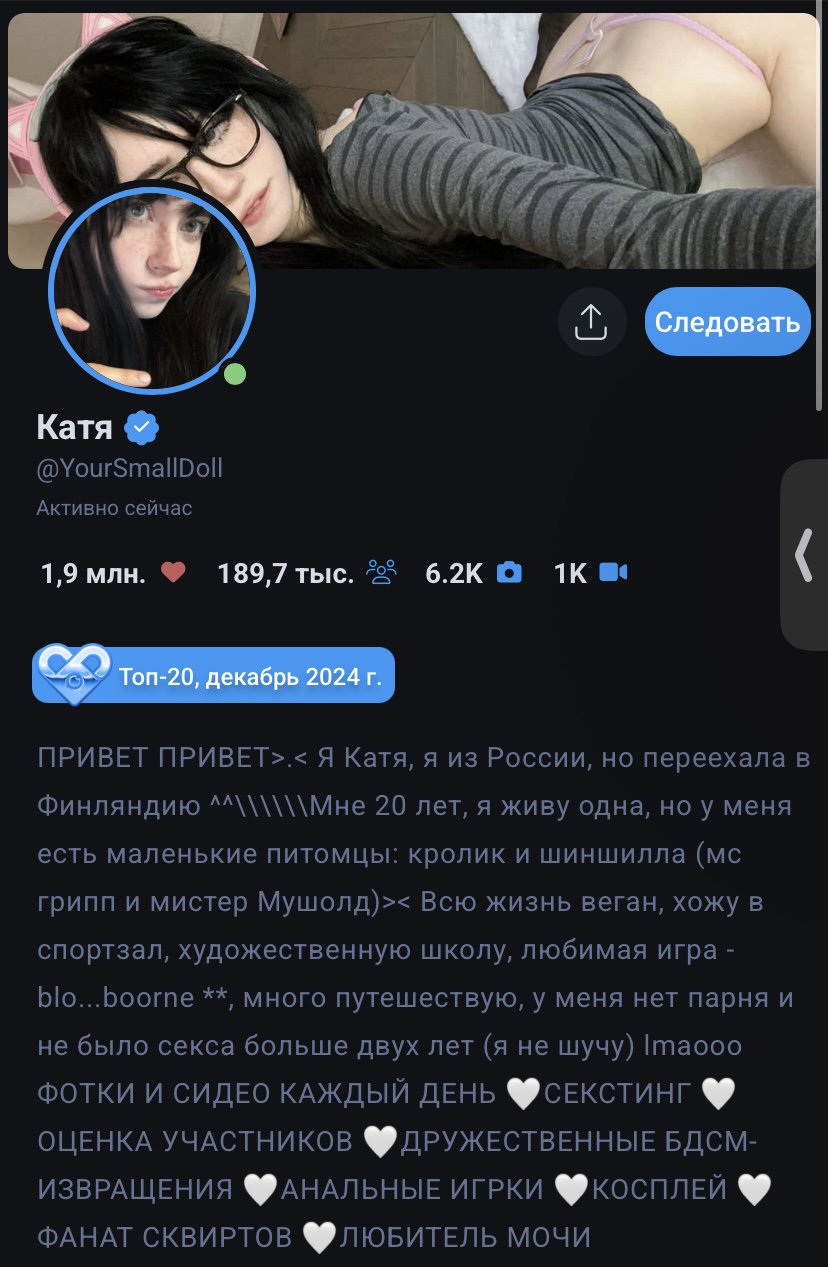 Я помню здесь катю онлифансершу с каре и около рпп телом, которая небритофетиш постила на фоне кукол всяких и на неё чушок какой-то дрочил, но перестал дрочить и улетел с горящей жопой, когда с ней золотой дождь выложили. Она кстати популярной стала потом в тиктоке зарубежном и вроде выехала с чуханской хаты и начала бриться и постить мейнстрим и стала популярной у иностранцев, но многие байтились на то, что она якобы на самом деле фембой. Видела в тиктоке кстати про неё ролик от якобы одноклассницы, что якобы она травила какую-то их общую одноклассницу и довела до ркн, но пруфов никаких в том ролике не было