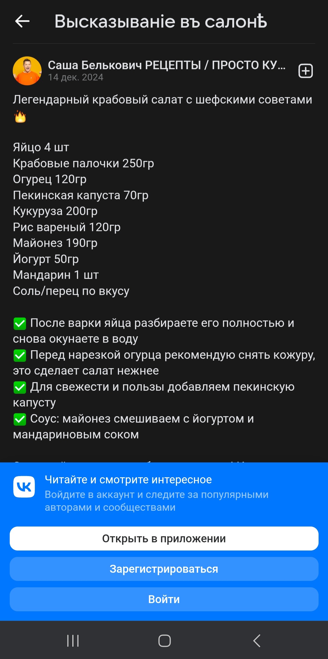 Сисы, посоветуйте свой любимый рецепт крабового салата. Буду благодарна даже за классический вариант, который вы готовите, только по возможности с пропорциями. Я вот выбрала 2 каких-то рецепта, но наверное остановлюсь на втором варианте и добавлю туда баночку креветок. Что думаете по поводу разбавления майонеза греческим йогуртом или сметаной?
