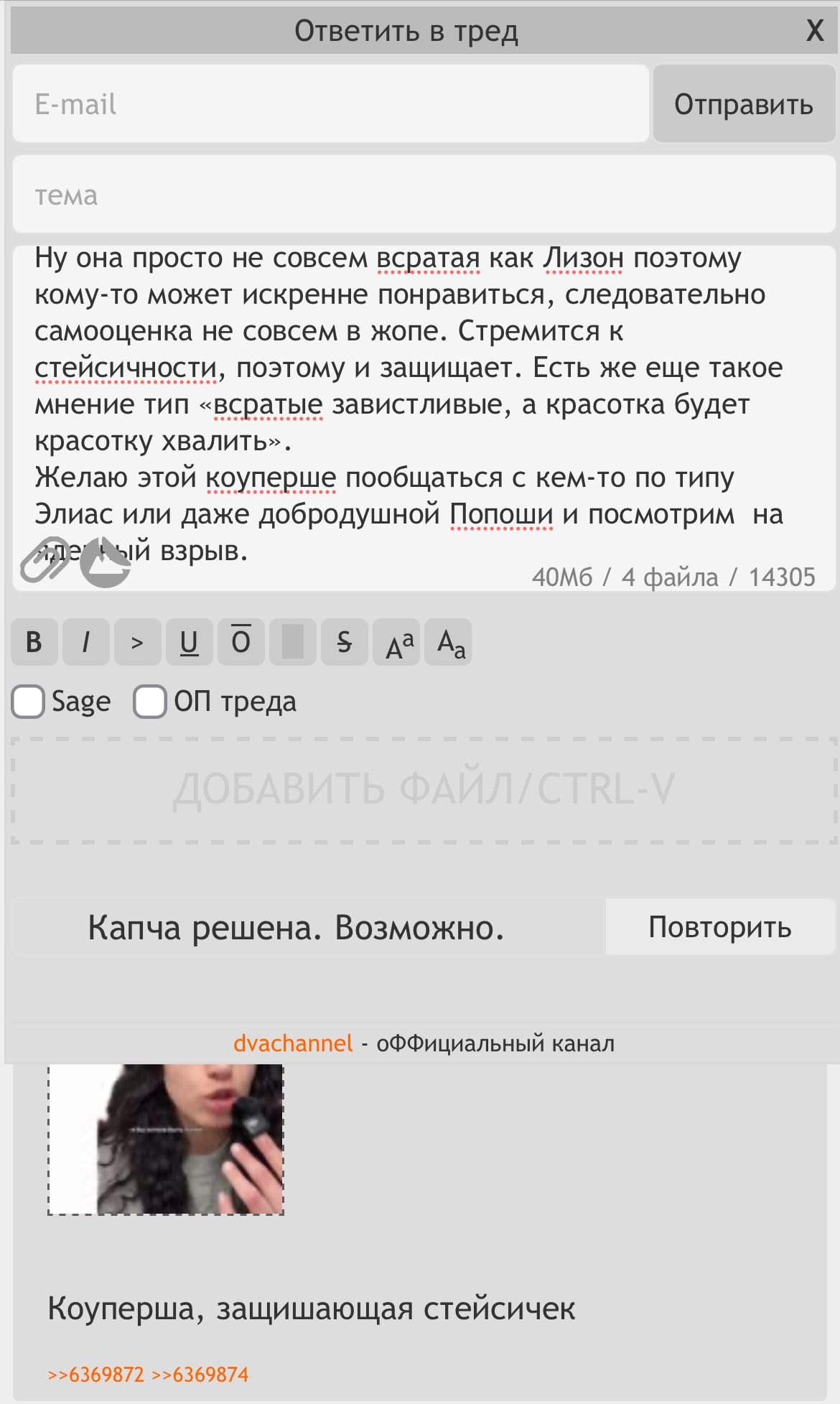 >>6368333 >>6368337 Кринжую с вас старух. Особенно с >>6368333 - высирать огромные пасты на пустом месте это надо уметь (в видео не упоминались её родители). А деваха по фактам сказала, но да, загнула немного про тело. Не надо вдруг делать вид, что у нас в рашке нет культа жизни в говне ("богатыми не были и неча начинать") и терпения (буквально одна из самых заезженных тем). Давно девач стал сбором нормисок или всегда так было?