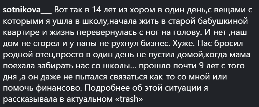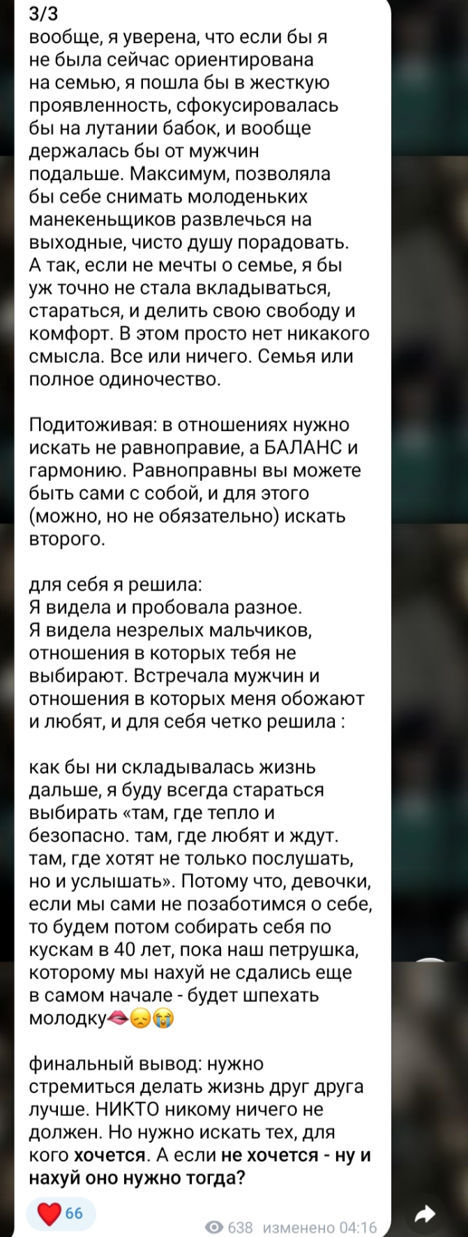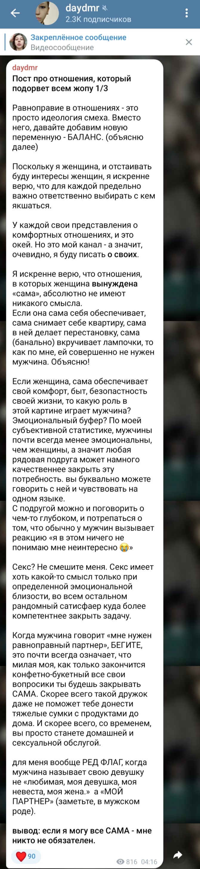 >>6370702 Мне жаль, что она всегда идёт в контексте придатка к мужчинам. Все о мужиках, все разговоры и посты. Было бы круто, если она развивала себя как профессионала и творческую единицу. Отношения это очень хорошо, но а как же самой за себя постоять? Она не озвучила, почему не идёт на психотерапию? Если уже ходит, то важно это транслировать. А то она как будто несёт знамя жертвы. Надеюсь у нее все встанет на рельсы и она будет счастлива.