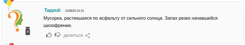 Вот зареклась же читать отзывы на фрагрантике на свои любимые ароматы. Там очередной сноб остроумно обосрёт твою любимую пшикалку каким-нибудь нелестным сравнением, и не то чтобы он не прав лол, и вот тебе это уже не развидеть, хотя до этого тащилась