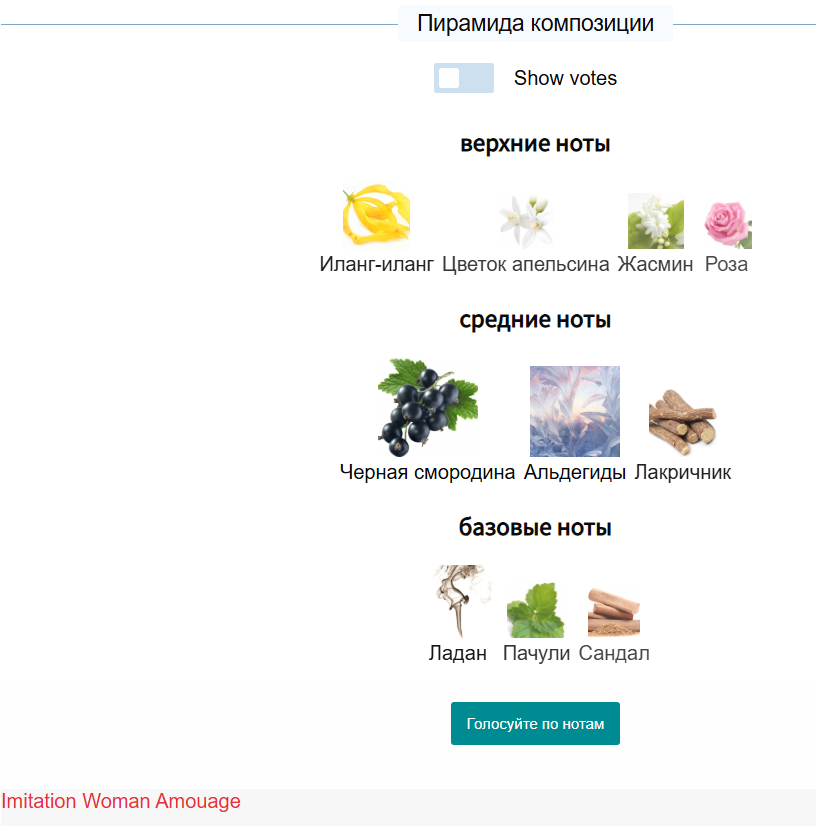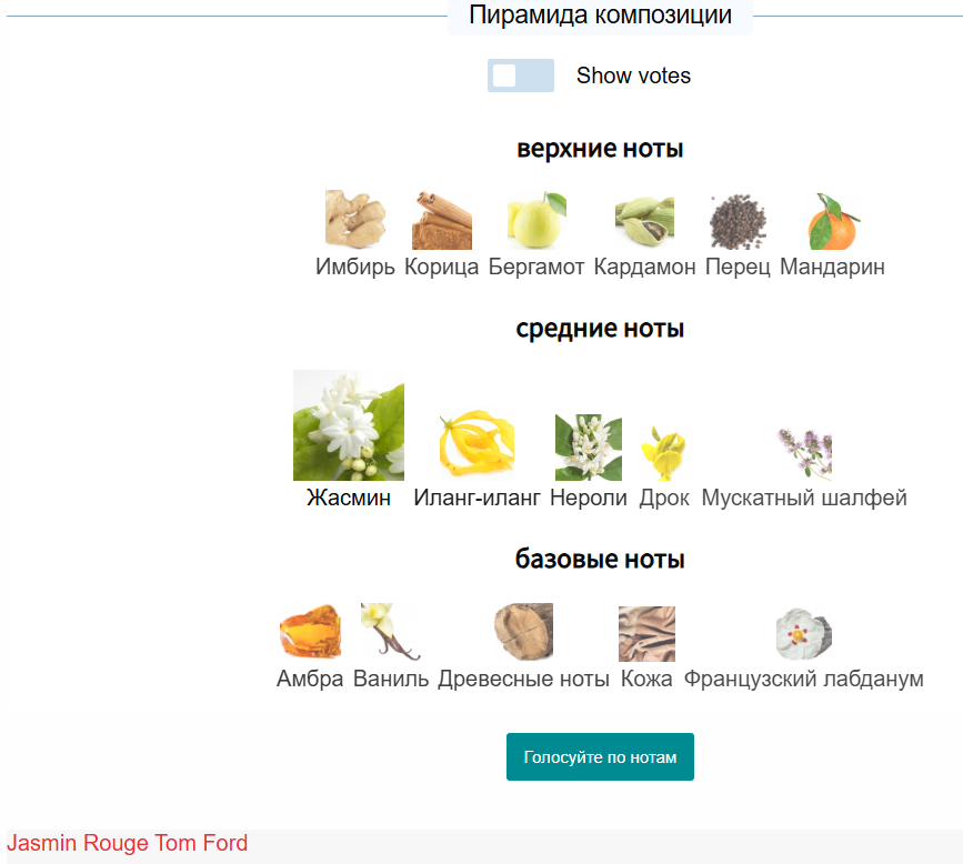Пирамиду не запоминала, просто глянула при покупке, что батч-код правдоподобный. Я не стремилась именно к жасминовому аромату, но на старте тут он и правда красивый, влажненький такой, натуральный (хотя я на нос не отличу жасмин от чубушника, а в РФ мы знаем как жасминовый аромат именно аромат чубушника). Дальше за полчаса жасмин куда-то съебался, и аромат стал ну оооочень похож на Imitation Woman Asmouage (есть отливант, носила его несколько раз на себе). Прям нюхаю и думаю "так, стоп, у меня это уже есть". Думала, в Imitatiom Woman меня ладан бесит, а тут в Jasmin Rouge та же самая свербящая нота, хотя в том фордовском ладана нет. Получается, это сам жасмин мне так бьёт в нос... Я хз, где и как хранился этот томфордовский тестер, ему уже больше 3 лет. Но по ощущениям у меня теперь очень громкий жасмин в Imitation Woman и жасмин потише в Jasmin Rouge. В томфордовском больше ничаво не уловила, хотя столько всего интересного в пирамиде заявлено.