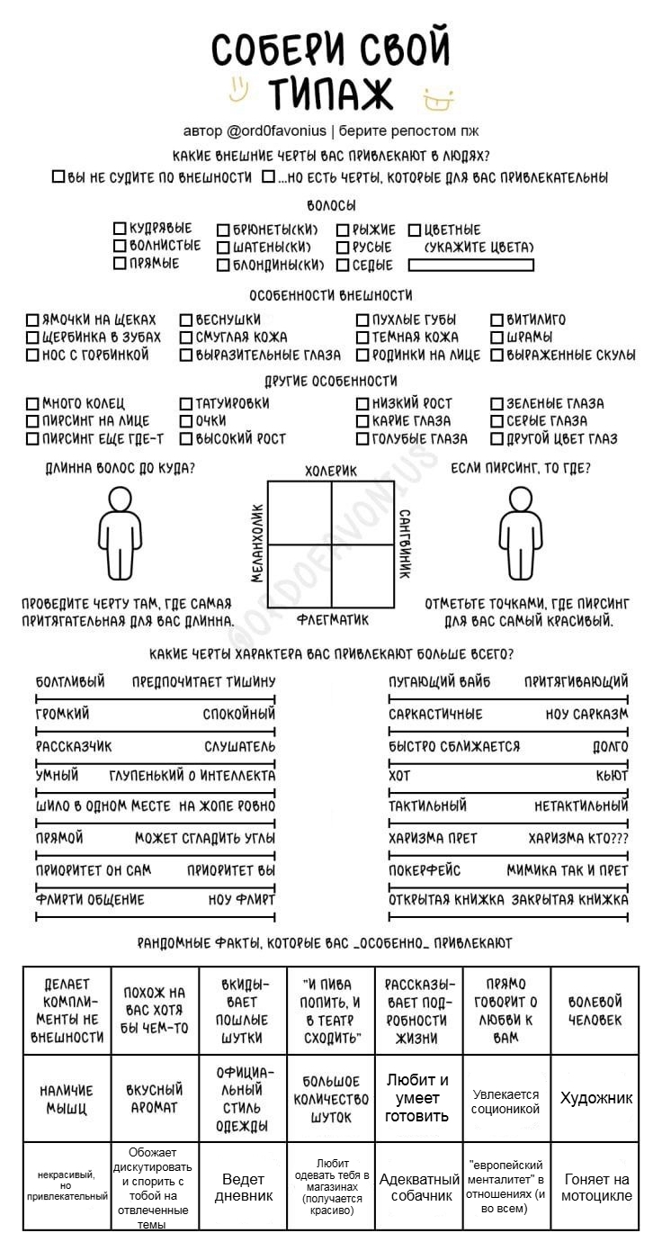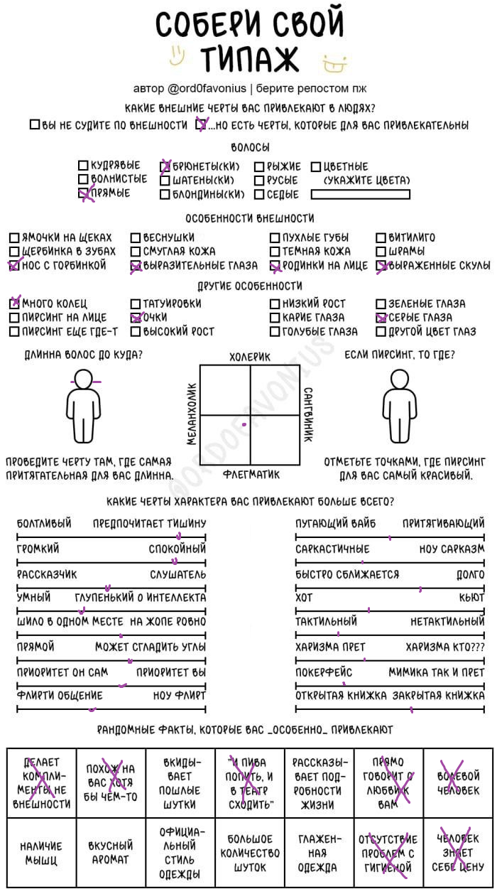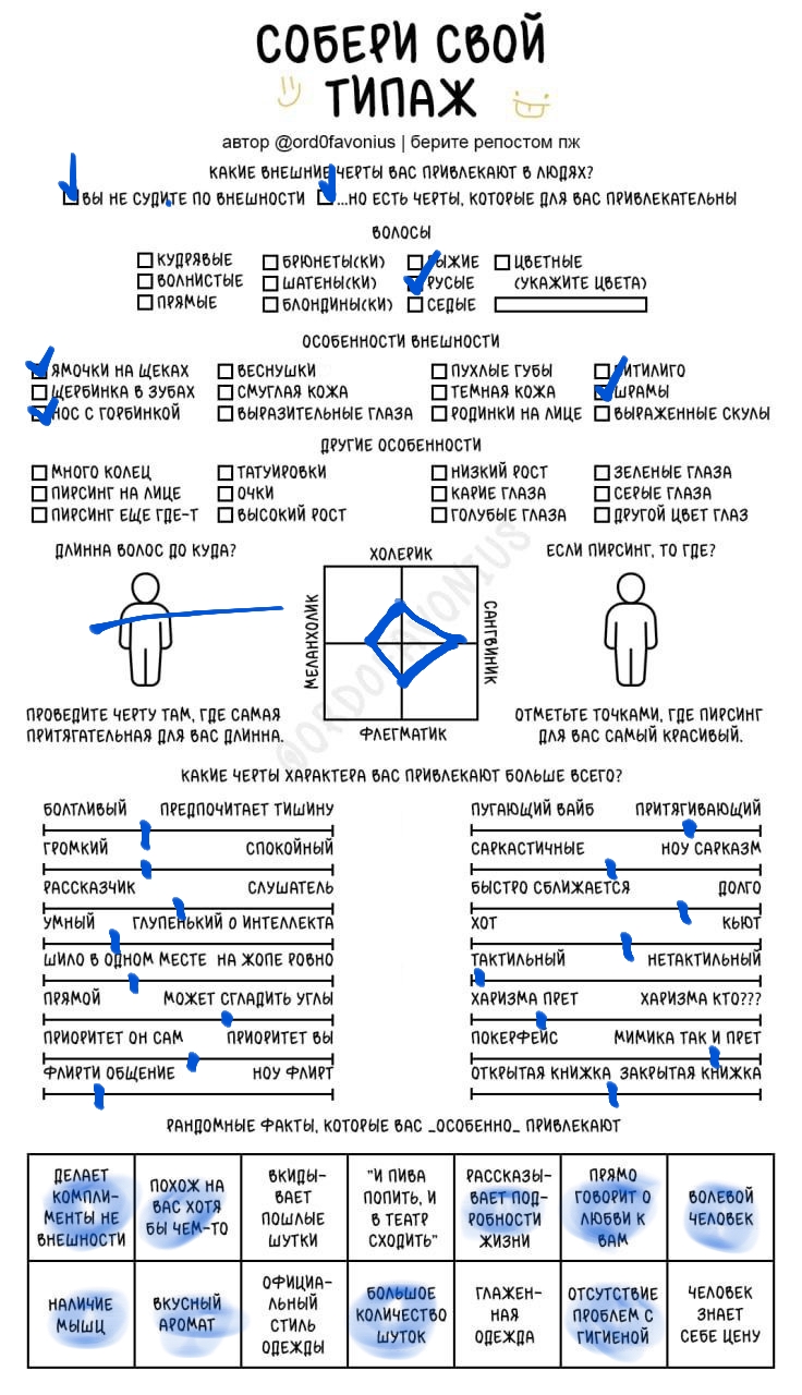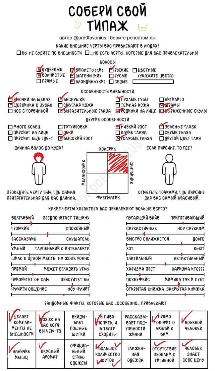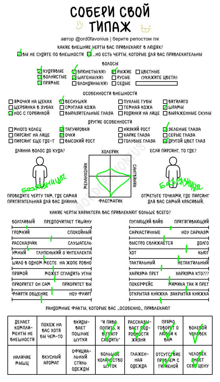 Мда, я думала это про девушек, а оказалось про чуханов. Первые пункты про родинки-пирсинг--щербинку-ямочки на щеках это прям дефолт предпочтения нетакусь любительниц нетипичной красоты.