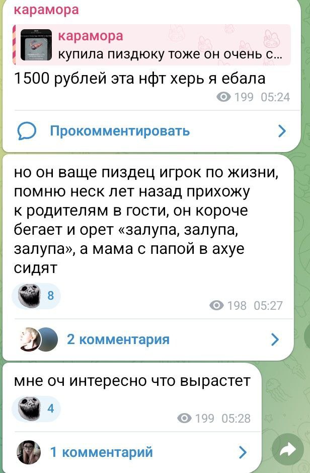 >>6382223 >>6382563 Ору, это комментарии у этой тянки под постом со скринами от росова. Все таки тянки, которые сами рвутся в такую тусовку и аудиторию – это обладательницы диагноза, тупости и безотцовщины в ее самом негативном проявлении.