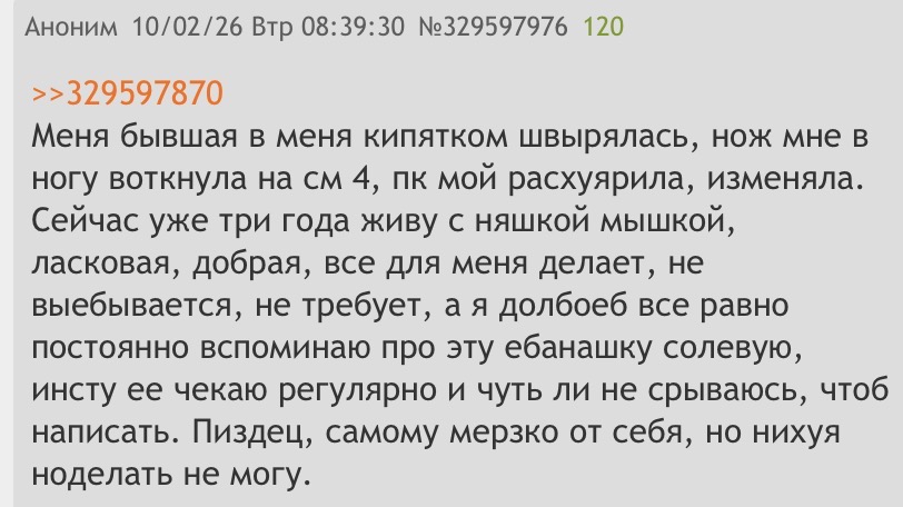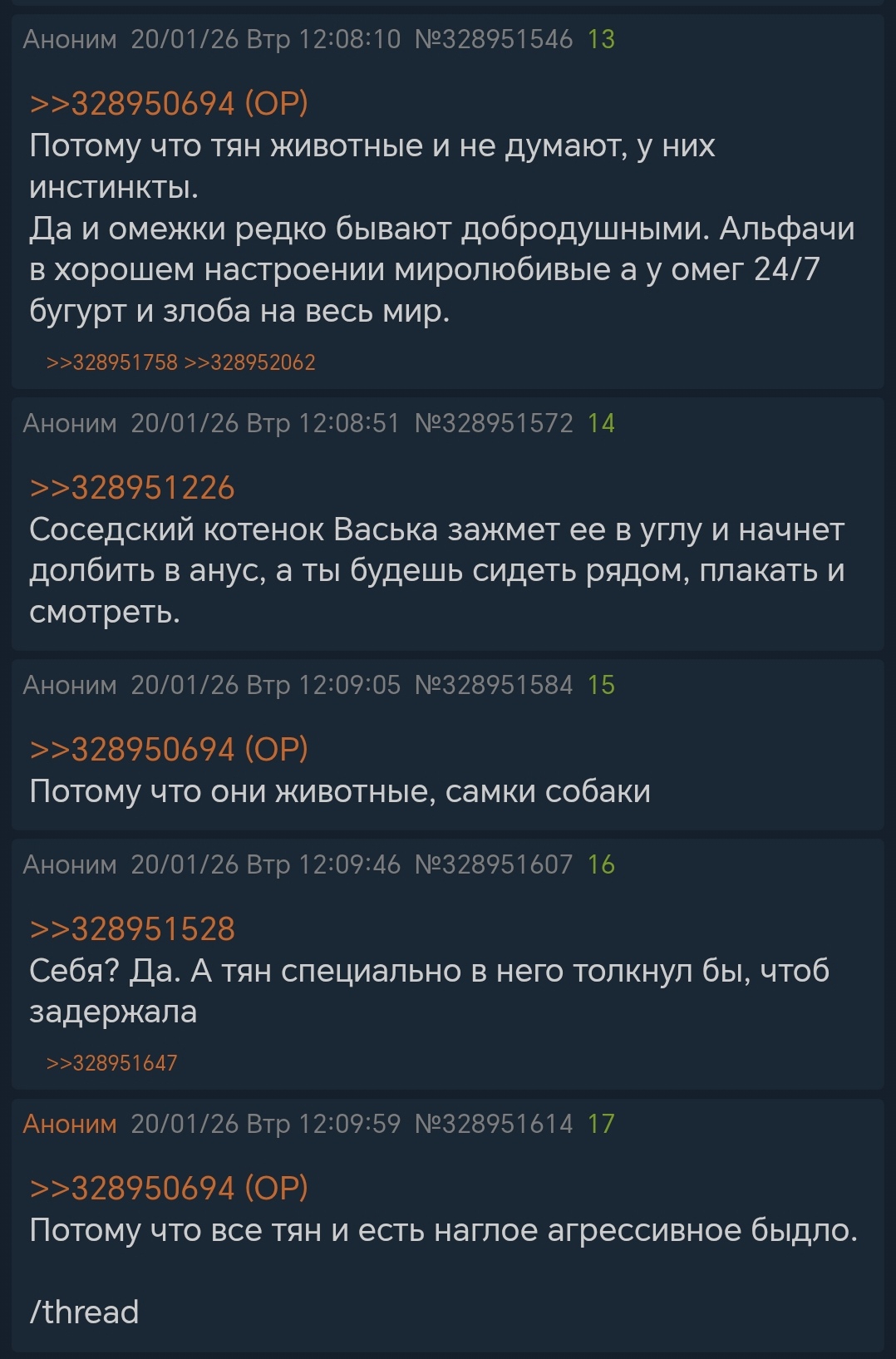 До блевоты противно представлять, что его хуй может побывать сначала в левой пизде, а потом он придет и мне привсунет. Хочется буквально рвать волосы на бошке от безнадёги и отвращения. Почему нужно было делать этих существ настолько скотоподобными? Одна из многих причин почему я больше никогда не выступлю в отношения. Только АВОКАДИНГ.