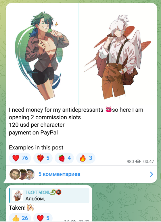 Сначала меня бесила ее упертость, а сейчас стало грустно, ну наверное работяг расстраивает что кто-то такие большие деньги лутает на своем навыке которым интересно заниматься. Мне вот тоже не верится что можно 1к долларов за арт получить, вот бы я так жила, жаль что нет толанта к красивому и интересному, сколько ни училась рисовать.