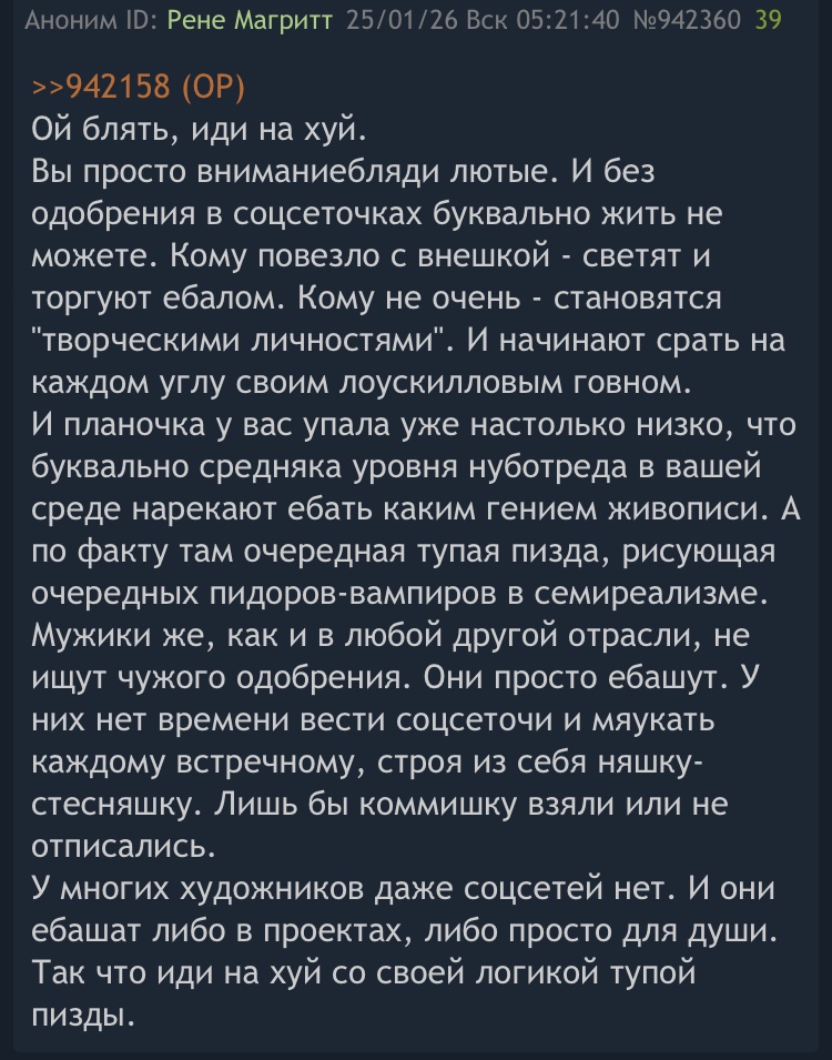 >>6417050 Что оно пытается доказать? Типа что оно умное? Что свою матушку ненавидет? Я хз, нам похлопать или что? Почему переодически подобие кунов лезет в бабское логово и пытается что-то донести? Какой смысл если а) всем похуй на твой свиные крики и не кто с тобой не согласиться и б) тебя кикнут отсюдова