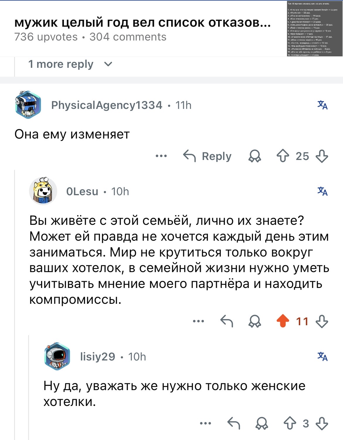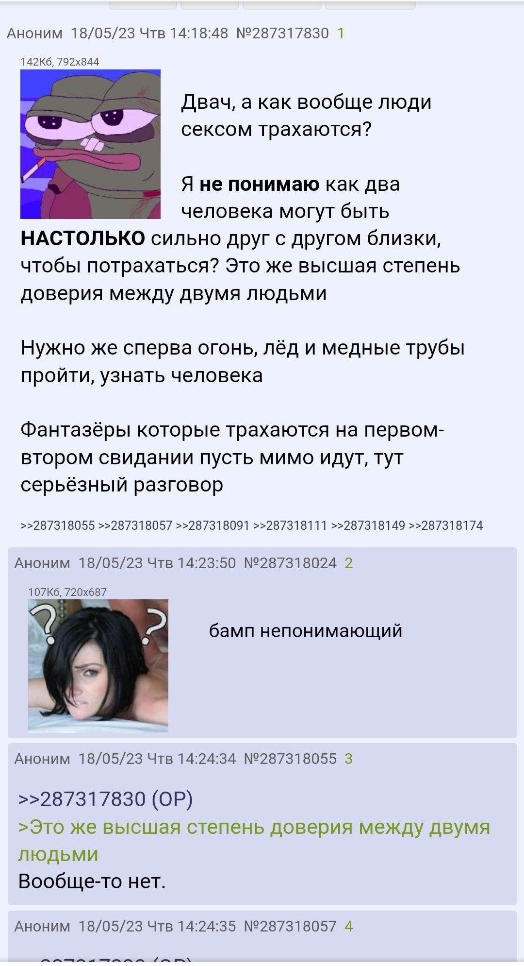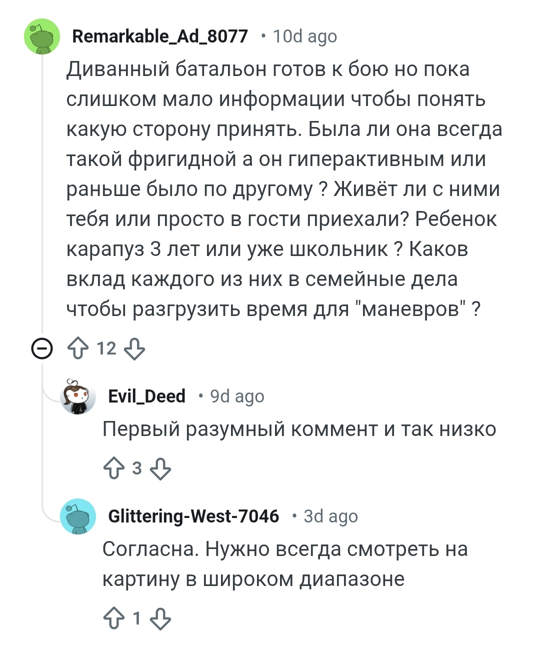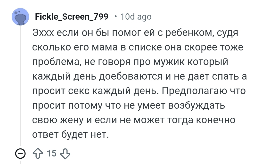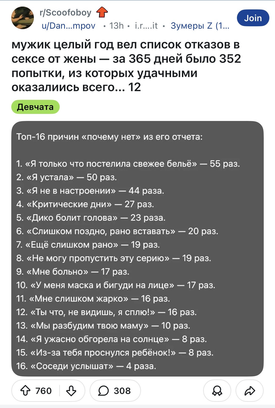 >>6425642 >>6438223 Я думаю он каждый день просто доёбываться хочет. Там в комментариях хорошо написали, что мужчина постоянно хочет секса пока не встретит женщину, которая постоянно хочет секса) Но вообще есть и адекватные комментарии.