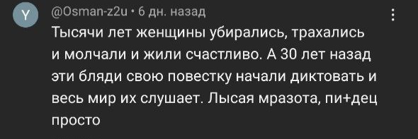 Просто в ахуе. Мужики засрали всю историю и весь инет мизогинией. Пишут про то, как же это нормально насиллвать малолеток, клеймят любых женщин насадками, тупо видят в женщине мясо для ебли, снимают, как женшины срут и ссут, дрочат на это и одновременно унижают тех, на кого дрочат, но ебанашки все равно женщины, конечно, классика. Охуеть вы ебаные лицемеры нахуй