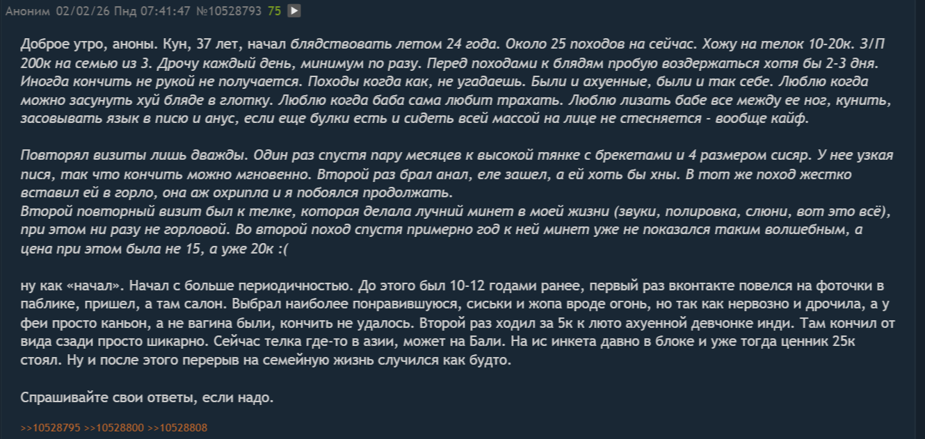 >>6410741 > Это чуть ли 80% мужла. Да там под 100%, у чуханов ебля на первом месте. Без этого тян не нужна. Если есть секс, то всё остальное можно перетерпеть, до поры до времени. Если чушку больше 15 лет, то он понимает, что говорить об этом тян в лоб нельзя, поэтому начинается всякий пиздеж, любовь морковь и вся хурма. с другой стороны, а как ещё тогда получить секс? что вам кажется более этичным: вешать лапшу на уши обычным тянкам или платить проститyткам?