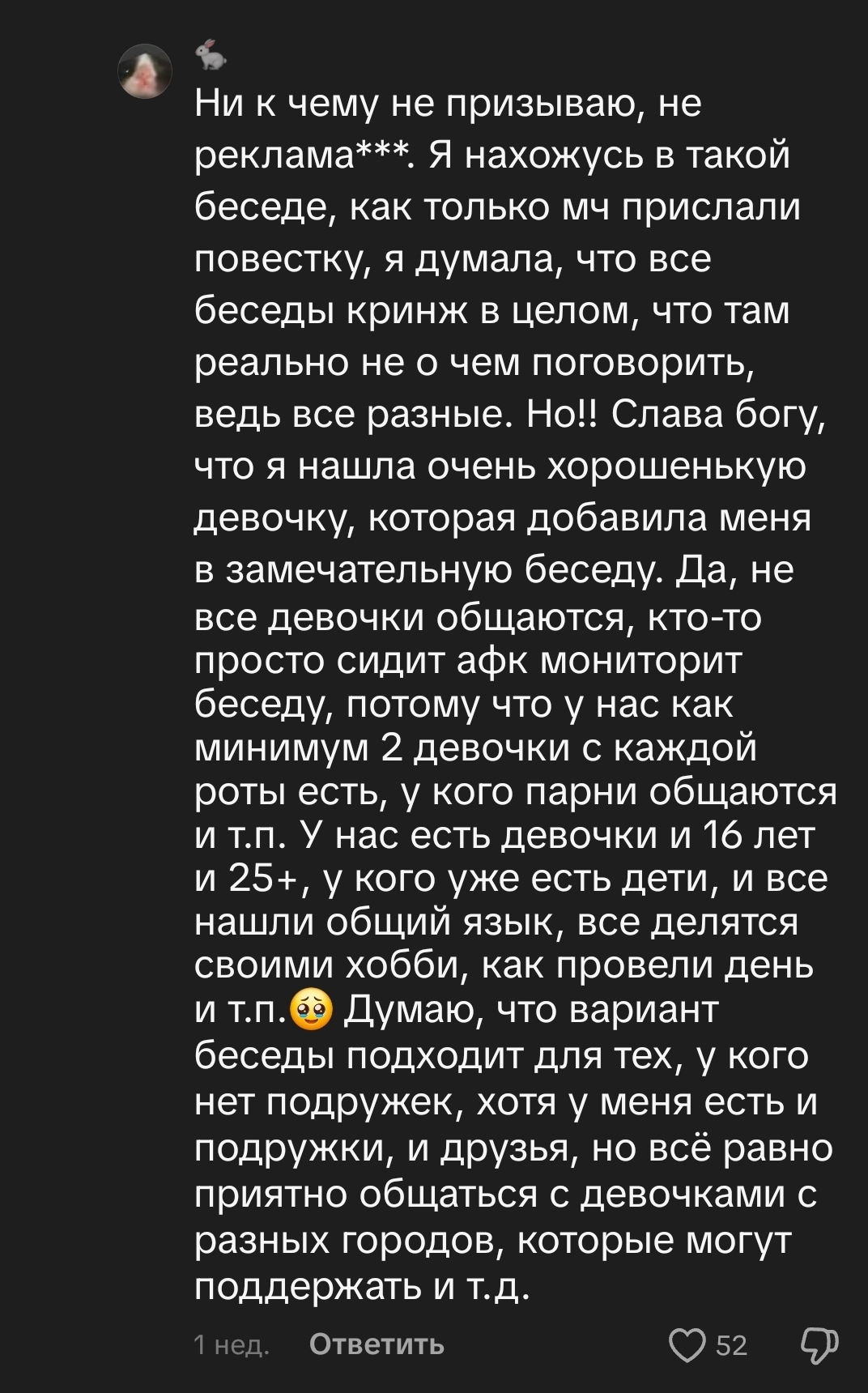 «Предупреждаю один раз: упаси Боже, если твоя религия мне не понравится» Я прекрасно знаю, как относятся к иудаизму и евреям сейчас многие люди, и прекрасно понимаю, что не хочу никаких религиозно-политических срачей и уж тем более преследований в своей жизни, поэтому в большинстве соцсетей умалчивала о том, что хожу в синагогу. Но мне конкретно надоели бесконечные докапывания и призывы переходить в ислам или обратно в христианство (но христиан, справедливости ради, очень мало было отбитых на моем пути), поэтому вчера я закинула в Тикток и Ютуб видео с религиозным каминг-аутом."