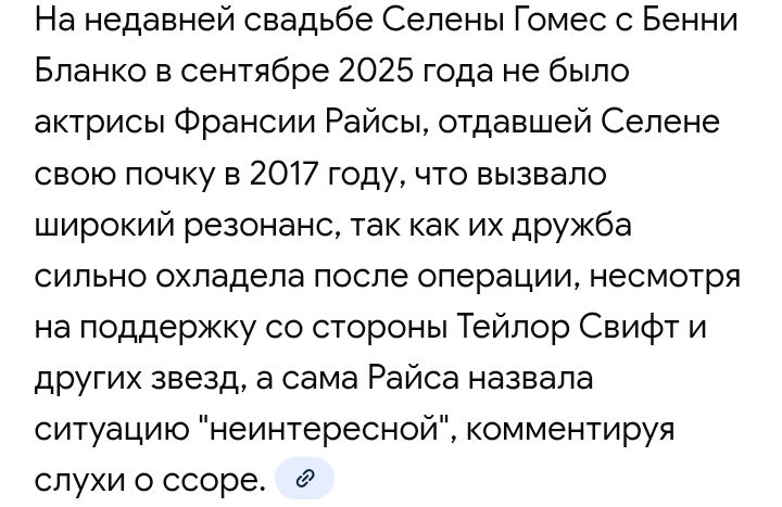 >>6409105 Подруга слишком добрая. Селенка тварь неблагодарная, даже не упомянула ее в близких друзьях и на свадьбу не позвала. Думаю это самое большое сожаление в ее жизни, что она согласилась на эту операцию. Нельзя никому кроме детей отдавать почки