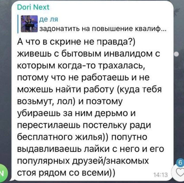 А че пиздюки не боятся того что майонезные опять жору натравят? Все таки уже два раза такое было. Когда в последний раз в такие тгк заходила, там срали нельку, шлюми, бебрину, а к шизокобану чуть ли не на вы обращались, подчеркивали ее заслуги как стримерши и прочие нализы