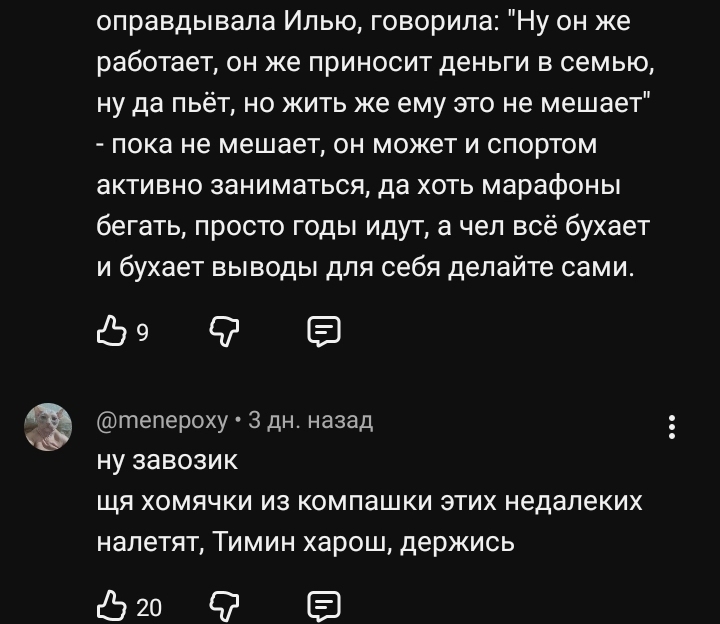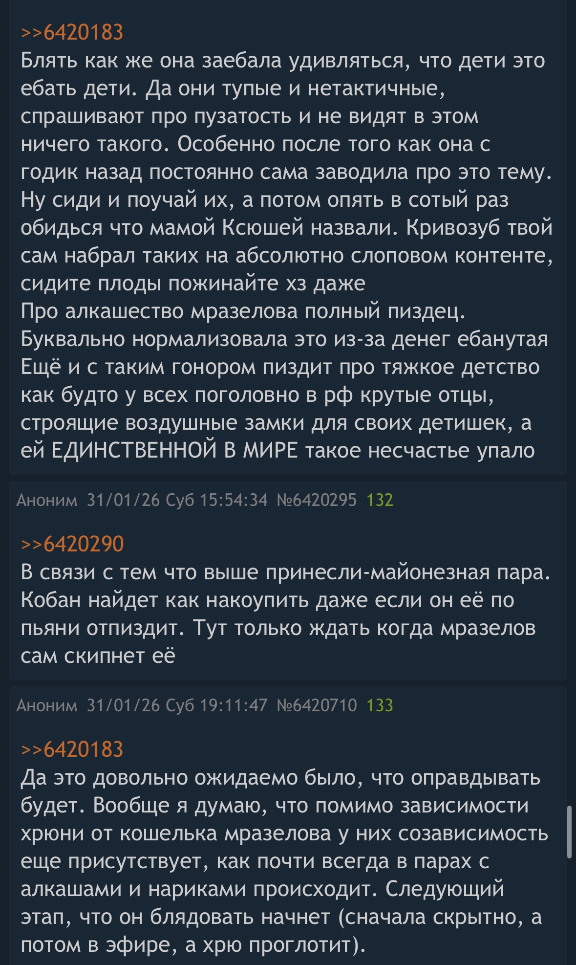 >>6420183 Блять как же она заебала удивляться, что дети это ебать дети. Да они тупые и нетактичные, спрашивают про пузатость и не видят в этом ничего такого. Особенно после того как она с годик назад постоянно сама заводила про это тему. Ну сиди и поучай их, а потом опять в сотый раз обидься что мамой Ксюшей назвали. Кривозуб твой сам набрал таких на абсолютно слоповом контенте, сидите плоды пожинайте хз даже Про алкашество мразелова полный пиздец. Буквально нормализовала это из-за денег ебанутая Ещё и с таким гонором пиздит про тяжкое детство как будто у всех поголовно в рф крутые отцы, строящие воздушные замки для своих детишек, а ей ЕДИНСТВЕННОЙ В МИРЕ такое несчастье упало