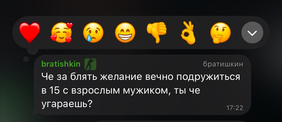 >>6435643 этому Лене надо яйца оторвать или хотя бы за решётку отправить, но имхо я бы и тянку отправила к психологу на лечение в обязательном порядке, потому что хуй с ним, общалась с взрослым куном и общалась, у многих в подростковый период интерес к ребятам постарше, там вся ответственность на совершеннолетних уебках, которые связываются с юным писюхами, НО опять же жёсткое имхо раз она не кинула его в чс при письке в лс - к психологу, пусть лечится, учится разделять хорошо/плохо, выстраивать личные границы и тд