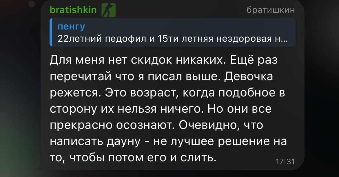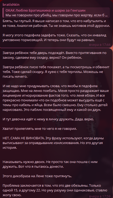 >>6435643 не, мы же все понимаем, что если малолетка ищет знакомства со взрослыми, то это не норм (не важно мальчик или девочка), но мы это понимаем, потому что мы постарше этих людей (надеюсь), то есть отчасти есть правда в словах вовы о том, что малолетки тянутся к старшим. не будем рассусоливать о псих. проблемах и так далее, все всё понимают. но почему вова не может понять того факта, что В ЛЮБОМ СЛУЧАЕ, если ты здоровый мужик старше 18 лет и кидаешь интимки\предлагаешь еблю\секстинг и тд малолетки, то это уже конкретно НЕ НОРМАЛЬНО СО СТОРОНЫ ВЗРОСЛОГО ЧЕЛОВЕКА. да, лёня объективно с отклонениями, никто нахуй спорить не будет с этим, это тип с того же среза, что миша анимешник и ваня золкин, они все под одно корыто идут почти. я, если что, не защищаю никого, мне поебать какая малолетка заобщалась со старпёром и наоборот, но я не могу смотреть как вова сидит и пиздит на одного, а потом говорит НООО и дальше гонит хуету. по правде говоря, если вова возглавил себя СОВЕСТЬЮ ТВИЧА И ШЕФОМ, то он должен сказать, что лёня именно педофил и долбаёб больной со справкой, а малолетке пожелать, чтобы она не занималась творчеством тесака, не искала на свою жопу инфоповоды и спокойно себе училась в школке без выебонов, не строила из себя нитакуську и медиа персону. дай бог ещё пару лет и она поймёт че творила и отрекнётся от этого, потому что это кринж, куда она нахуй полезла вершить правосудие. и без неё бы нашлись другие девчонки, которым бы этот лёня САМ бы написал и вкинул че только можно. короче, вова отчасти прав, но на мизерную часть, дохуя на себя берёт эта "совесть твича", чтобы так громко пиздеть че попало и на эмоциях.