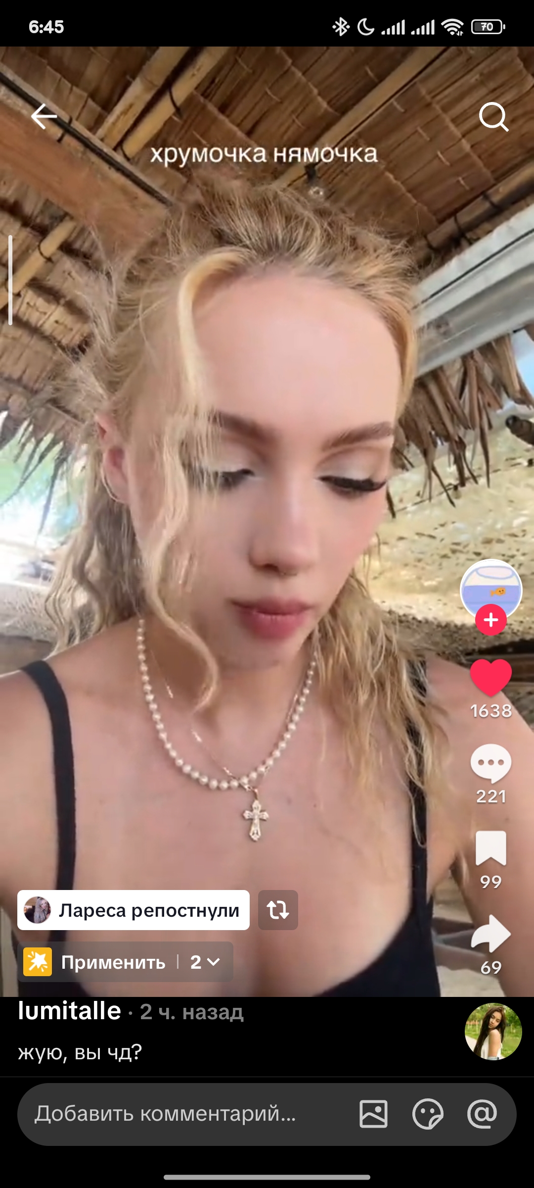 >>6453489 тик ток собралась покорять наша радость. таких как она, пол тик тока с мимикой на нуле и однотипными ракурсами. хомячки будут дальше её боготворить лишь потому что она писюха любимого данечки. лера по интереснее будет, хотя бы не боится себя показать в неудачном ракурсе