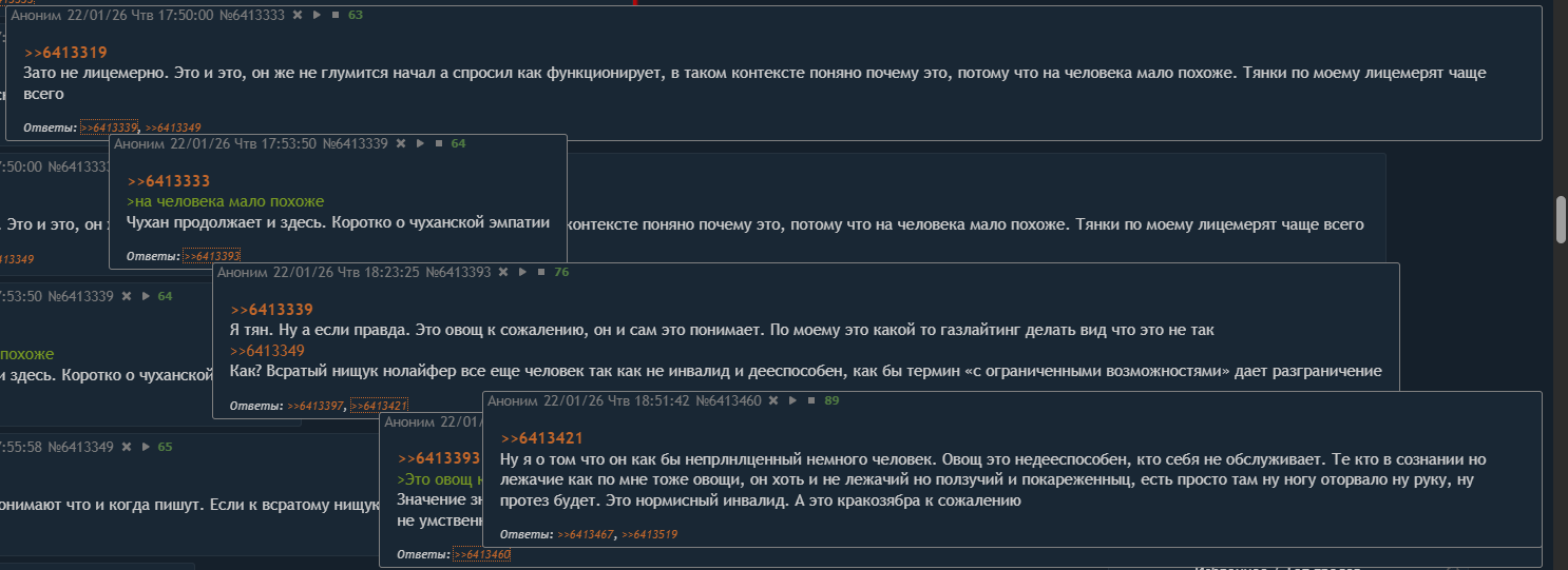 Часто аргументы сводятся к эмоциональным оскорблениям («зоошиза», «клиника», «аутист») вместо ответа по существу. Это видно в постах #15 и #20.