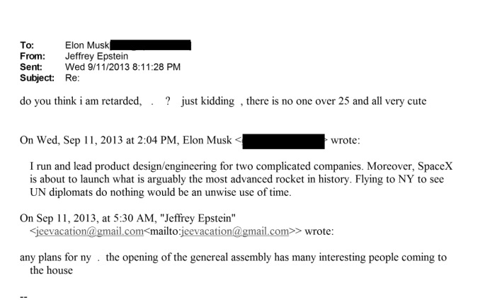 >>6421605 "В конце 2012 года Илон Маск отправил электронное письмо Джеффри Эпштейну с вопросом, планирует ли тот какие-либо вечеринки, поскольку Илону нужно было «отдохнуть»."