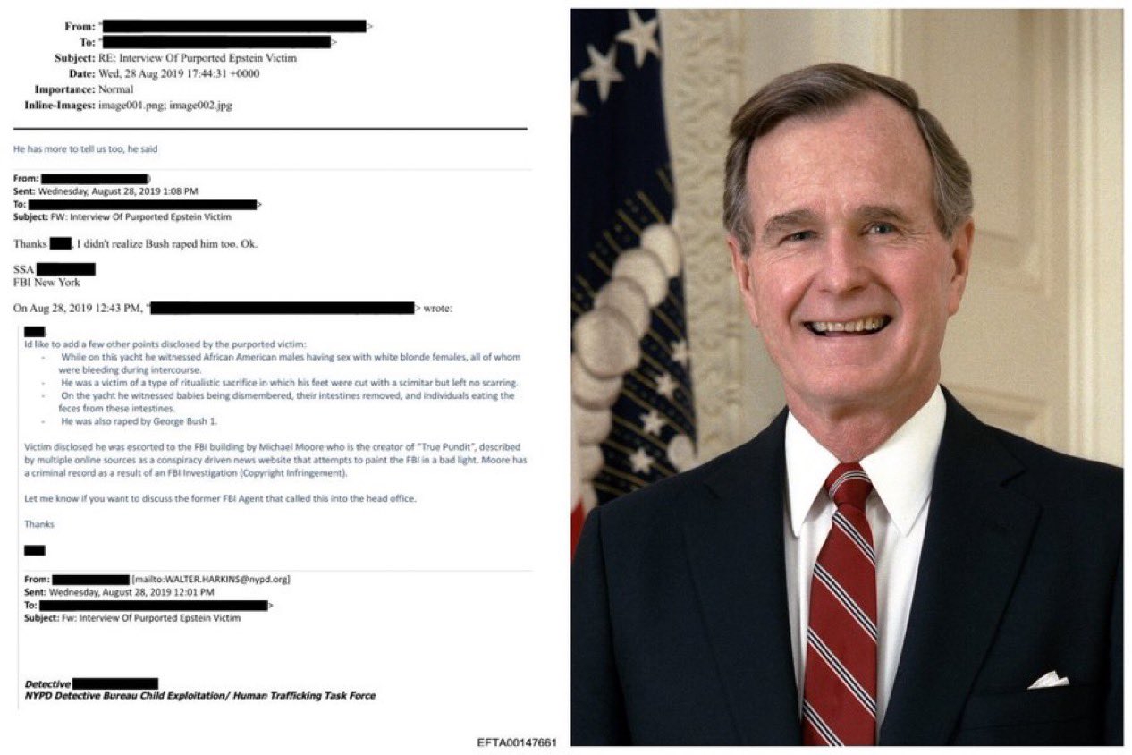 Утверждается, что Джордж Буш-старший изнасиловал мужчину, и что этот же мужчина был подвергнут ритуальному жертвоприношению, в ходе которого ему отрубили ноги мечом.