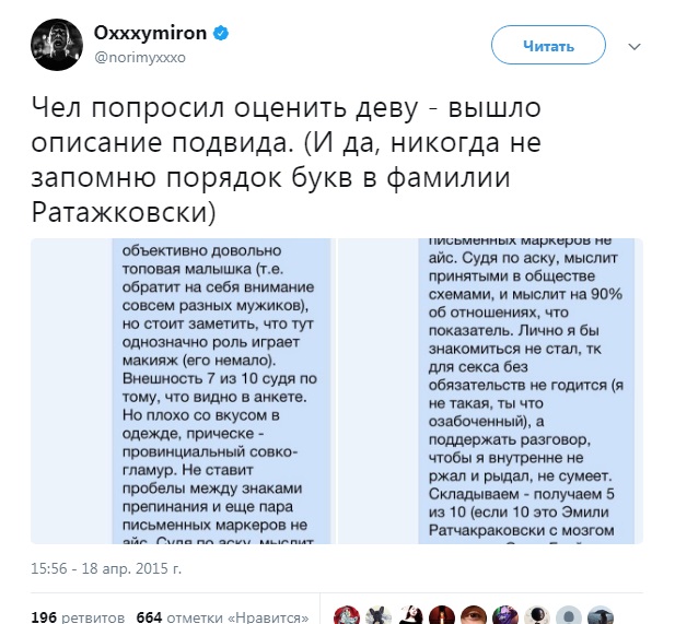 >>6422359 Нет, катя написала это на липсинг караморы, она не знает когда было снято, до или после работы. Это чисто хейт ради хейта. Это не констатация факта как если бы карамора выложила и подписала «после клиентов». Но что самле главное. В ответ на вежливое сообщение «тетя почему вы такая грубая?» катя пообещала «слить мамке пизду в спермаке» вместо ответа. Тогда никакого курьерства не сливали. 2020 год это бухгалтер 25к а не курьер. Ну один фиг лна небогатая и ходит с ксяоми, ей за 30, она считает себя феминисткой и спрашивает в чатах «как перестать оценивать себя как женщину в патриархате». При этом приходит оскорблять 18летних девочек